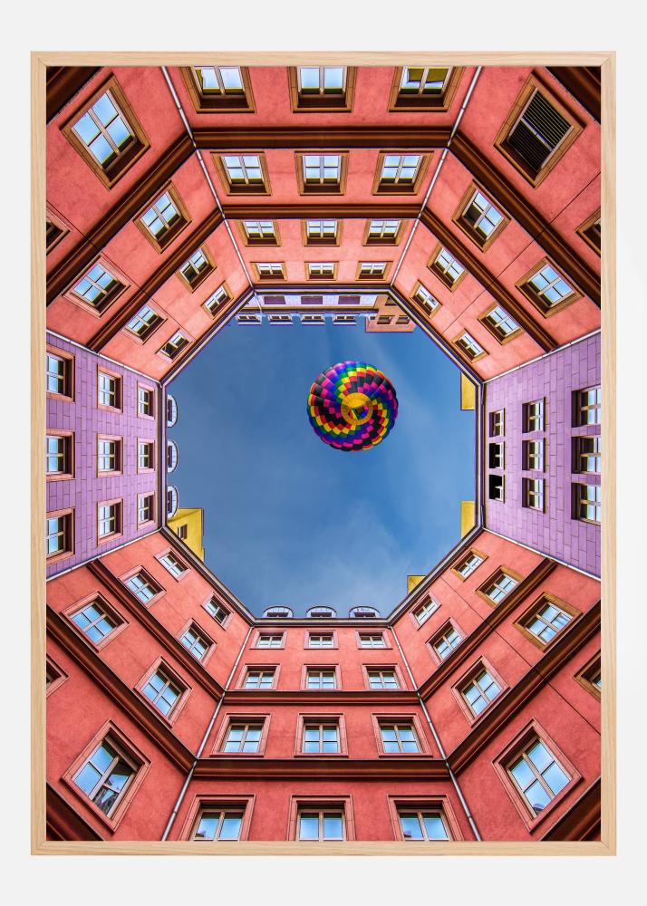 Żywy plakat z perspektywy żaby przez różowe budynki na tle jasnoniebieskiego nieba. Budynki tworzą heksagon, gdy patrzysz w górę poza wszystkie okna. Na środku niebieskiego nieba znajduje się balon w kolorach tęczy unoszący się nad otwarciem. Pozwól sobie na podróż w wyobraźni dzięki temu jasnemu, optymistycznemu obrazowi.