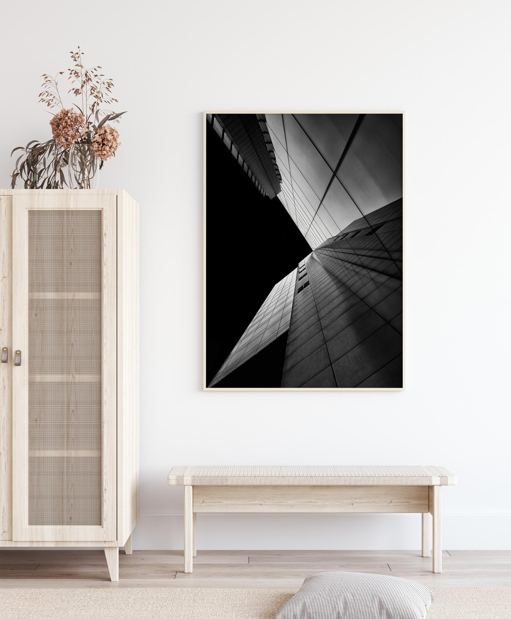 Architektoniczny czarno-biały plakat z bokiem budynku w nocy. Geometryczne linie okien prowadzą oko do punktu centralnego obrazu. Jasne białe budynki odbijają się w szkle, a nocne niebo tworzy silny kontrast z bokiem budynku. Połącz z kolorową ścianą, aby maksymalnie zwiększyć kontrast.