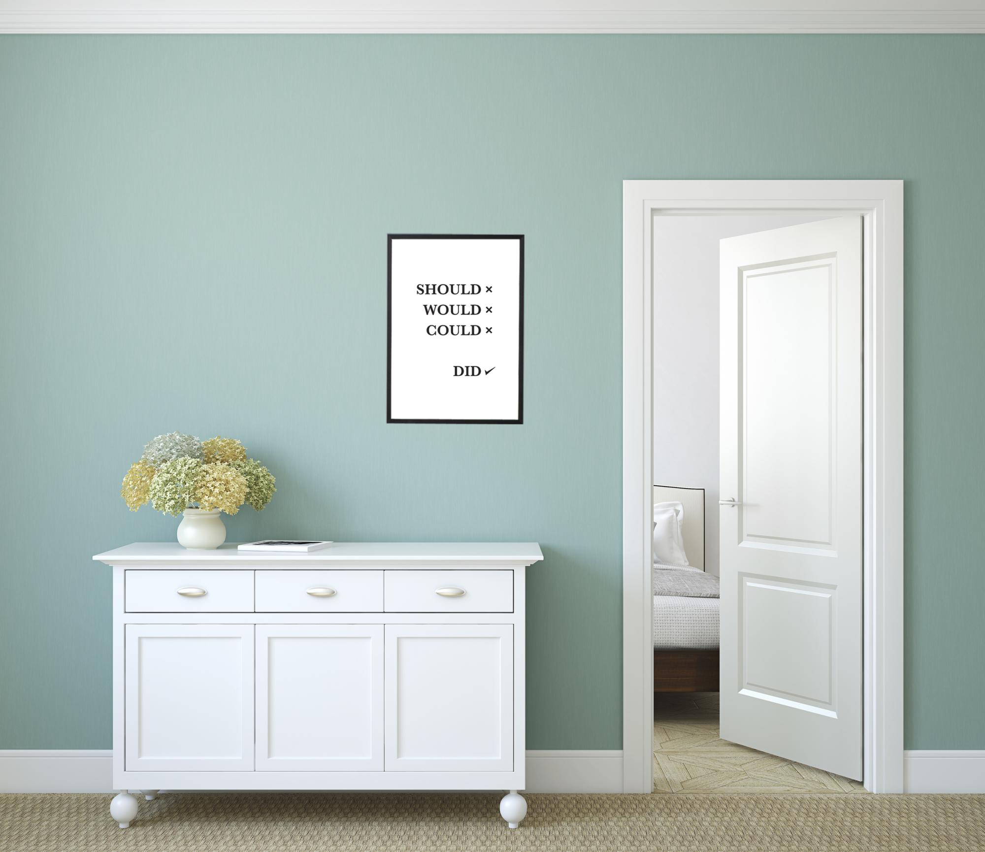 Dlaczego komplikować wszystkie genialne pomysły, które przychodzą ci do głowy, ograniczającymi myślami? Po prostu to zrób! Z tą plakatem na ścianie nie ma już wymówek. Plakat jest biały z czarnym nadrukiem zawierającym listę z tekstem "Should Would Could", gdzie każde słowo ma krzyżyk obok. Na samym dole znajduje się słowo "Did" z haczykiem obok. Czarnobiała projektowanie świetnie komponuje się z kolorową ramką. Ponieważ plakat jest dostępny w kilku różnych rozmiarach, znajdziesz go zarówno na biurko, jak i na ścianę.