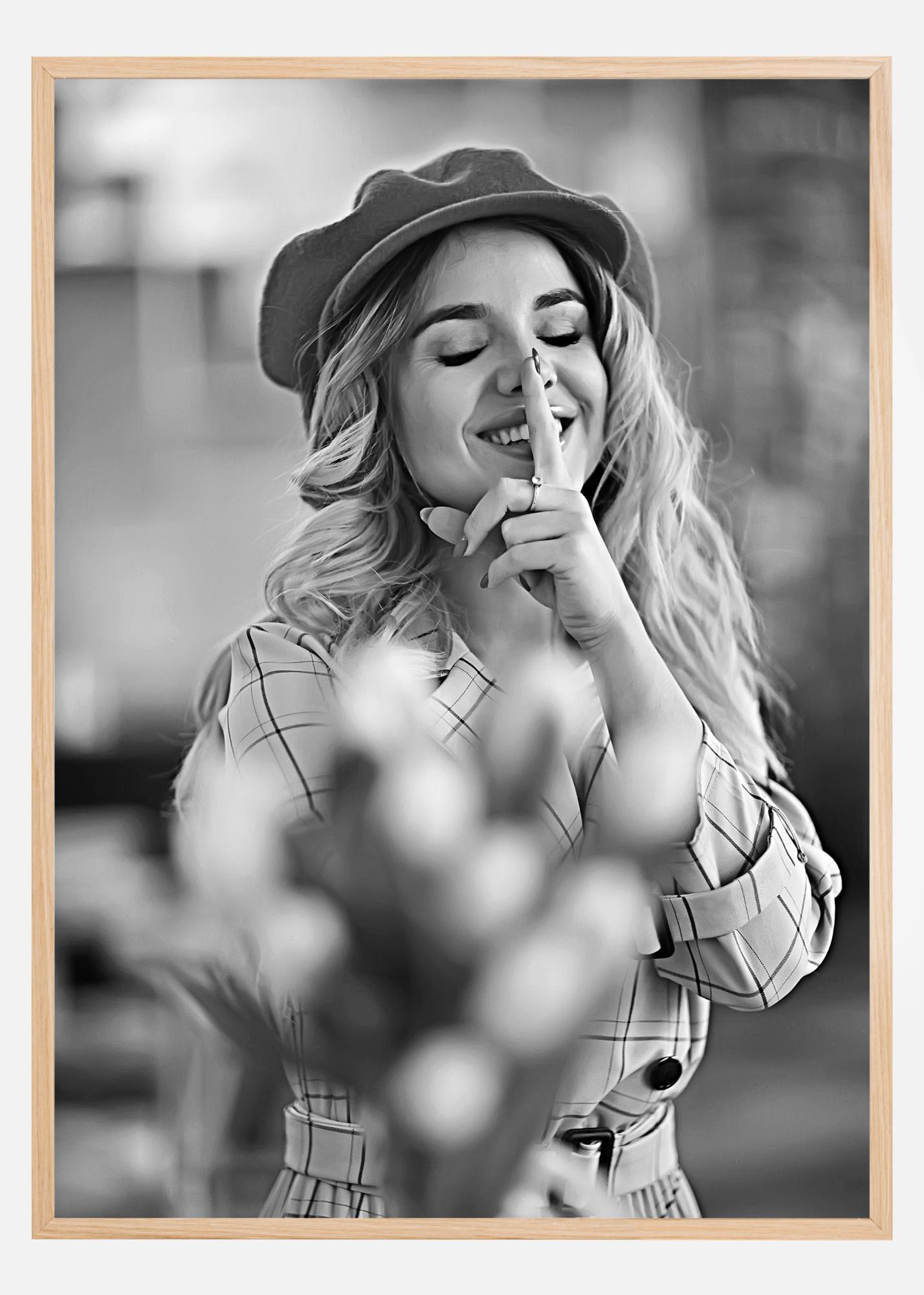 Zuchwały plakat portretowy z dziewczynką z palcem przy ustach. Blond włosy opadają spod jej kapelusza, a ta słodka dziewczynka szeroko się uśmiecha, unosząc uspokajający palec do ust. Ten czarno-biały obrazek poprawi Twój nastrój każdego dnia, gdy się obudzisz i go zobaczysz.