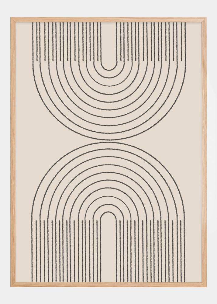 Ten minimalistyczny plakat uchwyca istotę prostoty dzięki swojej opływowej, architektonicznej konstrukcji. Eleganckie łuki, rysowane z precyzją, tworzą poczucie spokoju i struktury, podczas gdy czarny na białym tle daje wyraźny wizualny kontrast, który jest zarówno odważny, jak i prosty. Ta artystyczna reprezentacja jest zarówno nowoczesna, jak i ponadczasowa, pasująca do wielu różnych stylów wnętrz.