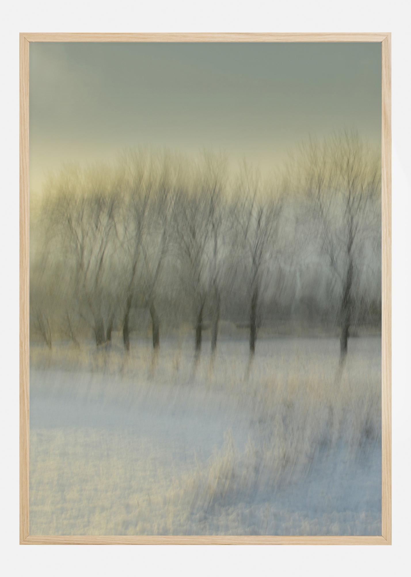 Fantastyczny plakat w stylu motion blur z drzewami na zimowym tle. Biały śnieg pokrywa wszystko na tym miękkim, nieostrym obrazie. Drzewa są rozmazane, widać tylko wysokie czarne pnie, a miękki żółty pas unosi się nad wierzchołkami drzew. Magia dosłownie unosi się w powietrzu.