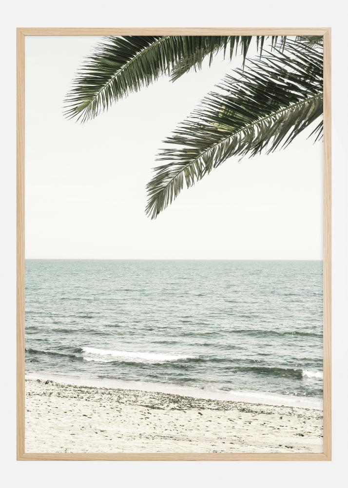 Poczuj spokojną atmosferę tropikalnego schronienia dzięki temu plakatowi, który uchwyca widok kołyszących się liści palmowych na tle błękitnego nieba i spokojnego morza. Kojąca scena plażowa jest oprawiona przez żywe zielone liście, tworząc naturalny efekt okna i zachęcając widza do marzeń o cieplejszych szerokościach geograficznych.