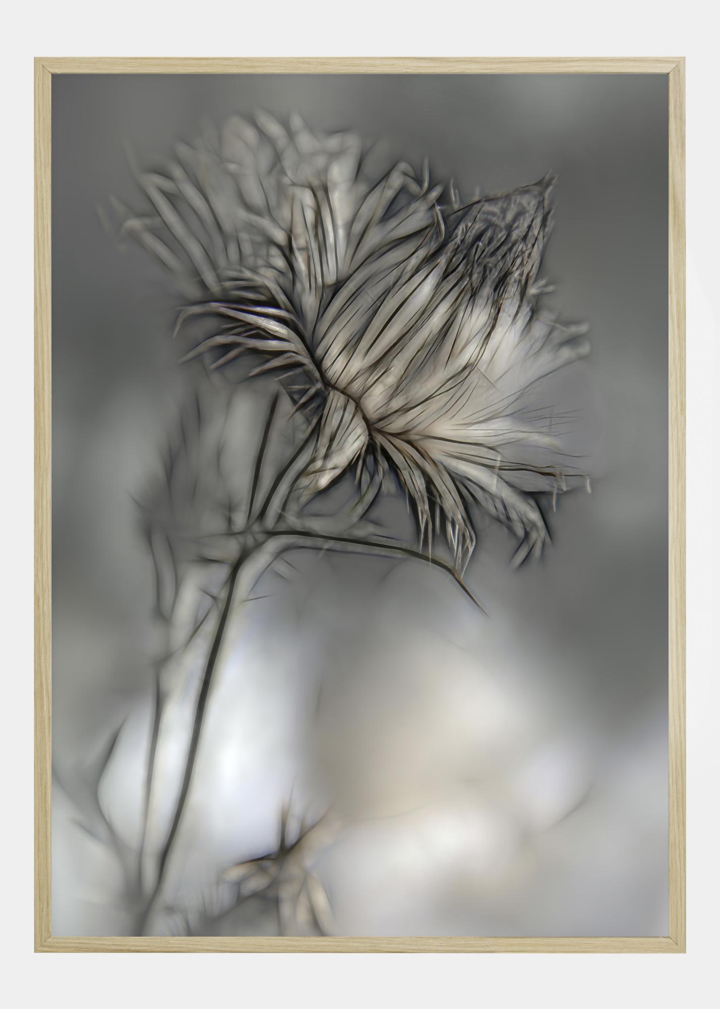 Zbliżenie plakatu z główką kwiatu. Miękkie niebieskie, szare i różowe kolory wypełniają obraz, gdy kwiat jest wyraźnie zarysowany na miękkim, rozmytym tle. Możesz niemal wyciągnąć rękę i zerwać kwiat z tego fantastycznego, miękkiego obrazu.