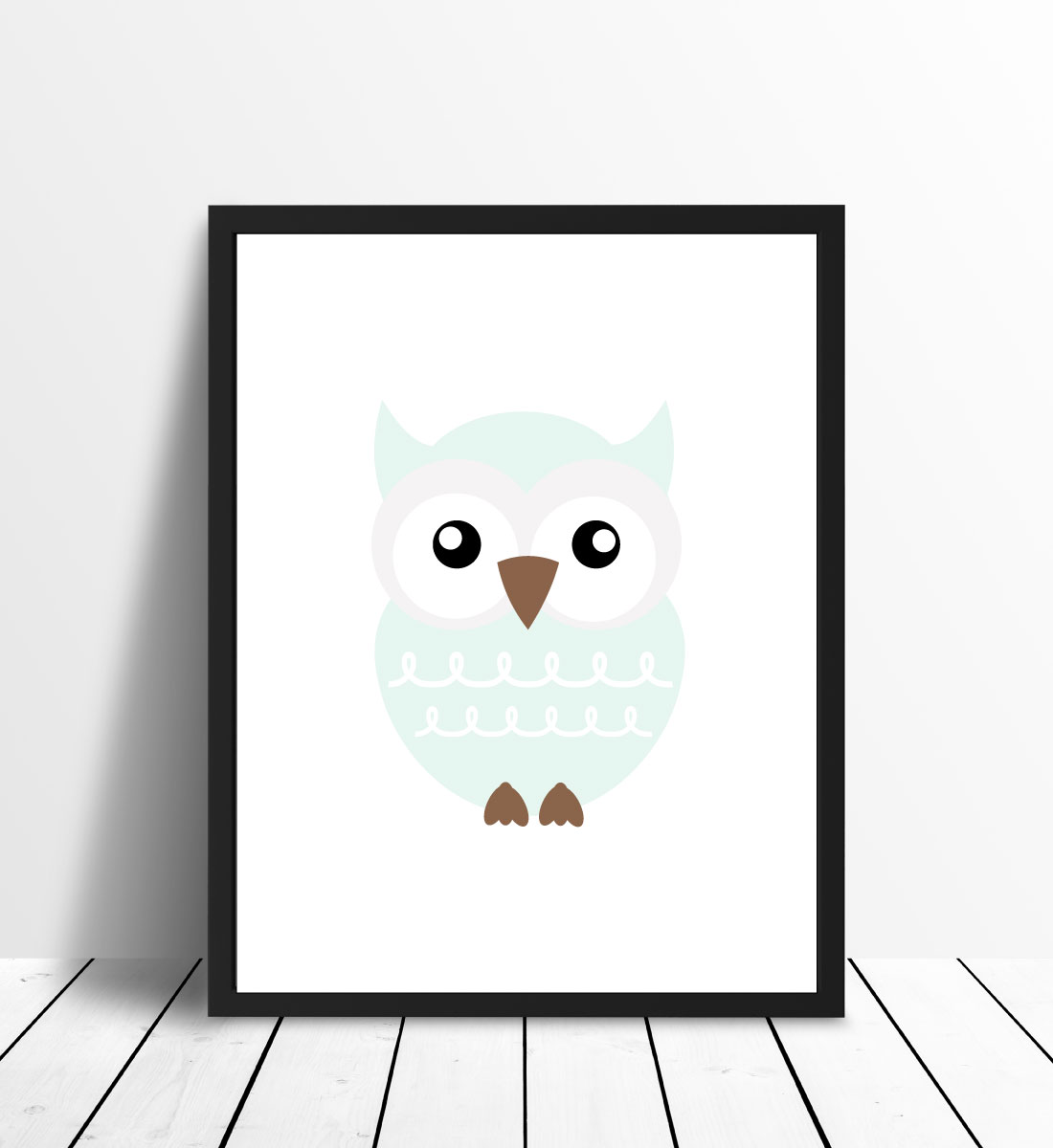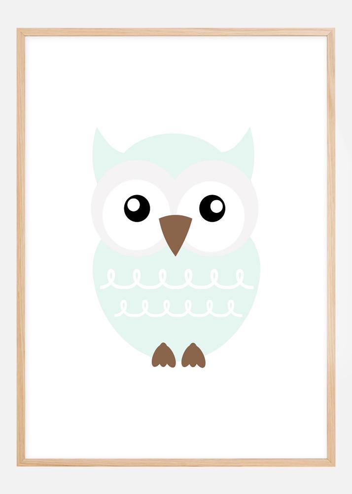 Słodki plakat z najmodniejszym ptakiem, sową. Ilustracja stylizowanej lodowo-niebieskiej sowy na białym tle stała się nowoczesnym klasykiem. Motyw pasuje zarówno do salonu, jak i pokoju dziecięcego, szczególnie w aranżacji, która podkreśla kolor na obrazie. Połącz z innymi ptakami lub zwierzętami, aby uzyskać dzikie wrażenie.