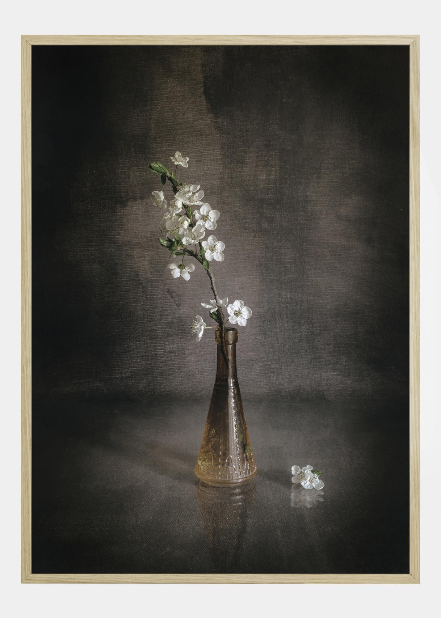 Plakat wiosenny z białymi kwiatami w cienkim brązowym wazonie. Wazon rzuca cienie w dwóch kierunkach i tworzy jasny punkt skupienia, gdzie gwiaździste kwiaty rosną w kierunku ciemnobrązowych szerokich pociągnięć pędzla na ścianie za nim. Przyjrzyj się temu eleganckiemu martwemu naturze.