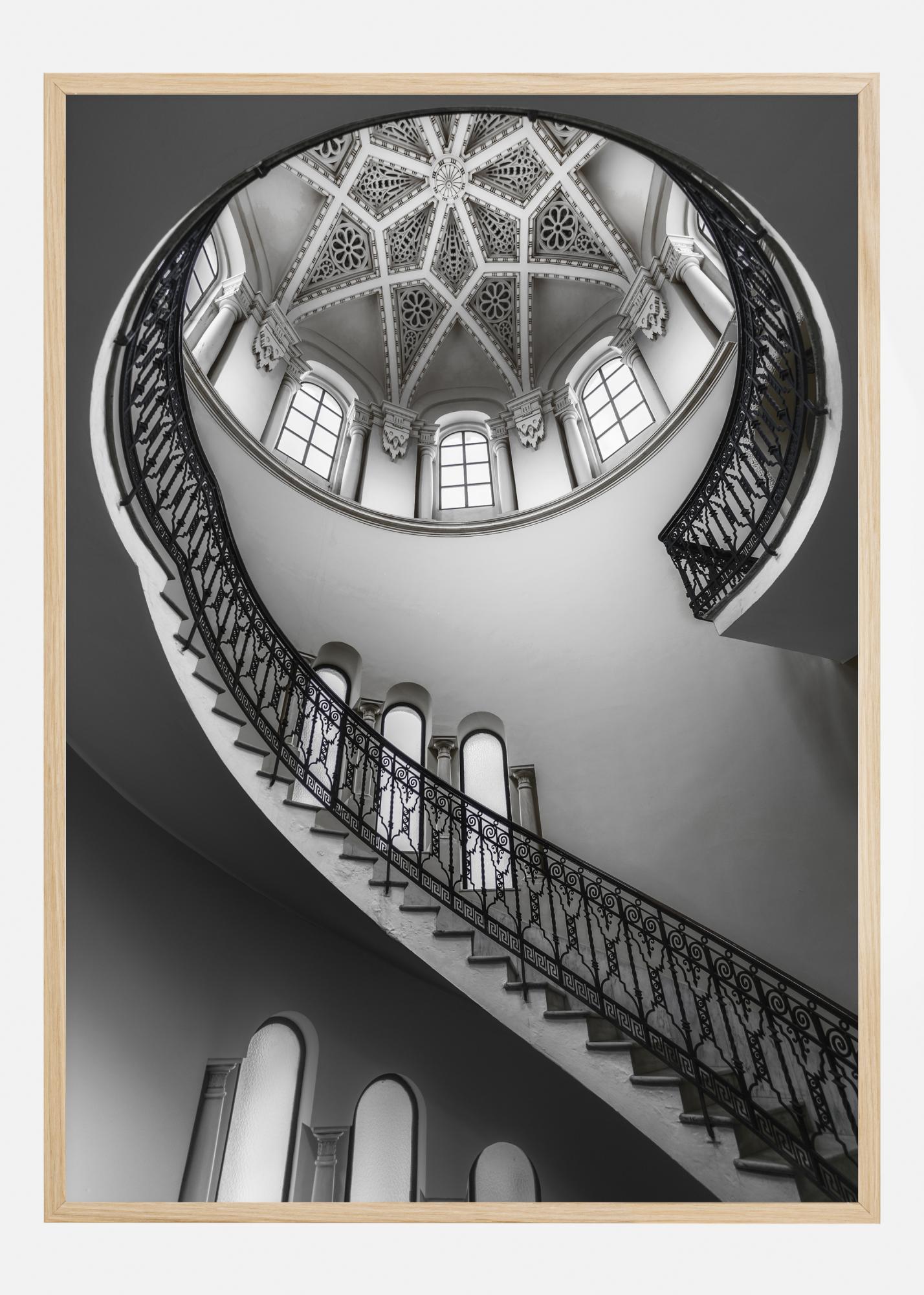 Skomplikowany plakat z wnętrzem budynku. Kręte schody z kunsztownymi kutymi żelaznymi prętami wspinają się ku sufitowi. Wzrok kieruje się ku kopule z fantastycznym wzorem kratowym i jasnymi oknami, przez które wpada światło. Elegancja i bogactwo detali łączą się w tym czarno-białym obrazie.