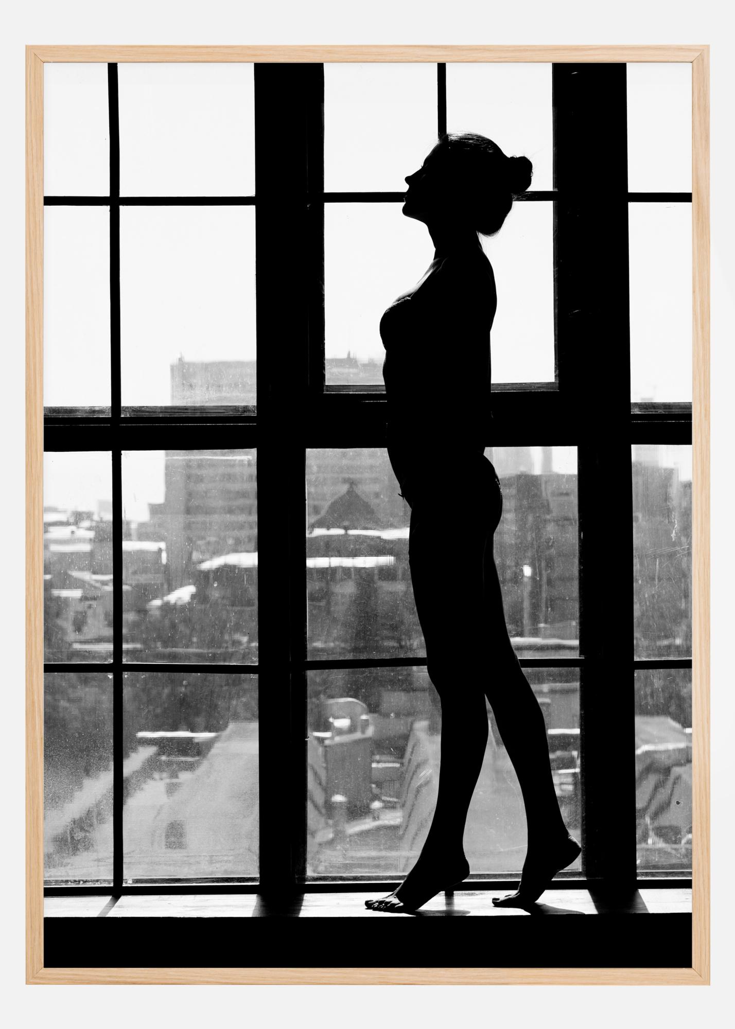 Sztuka fotograficzna w skali szarości przedstawiająca kobietę stojącą w dużym industrialnym oknie. Światło z tyłu czyni kobietę ciemnym sylwetką na tle miasta na zewnątrz. Stylowy plakat, idealny do połączenia z innymi ulubieńcami na większej ścianie z obrazami.