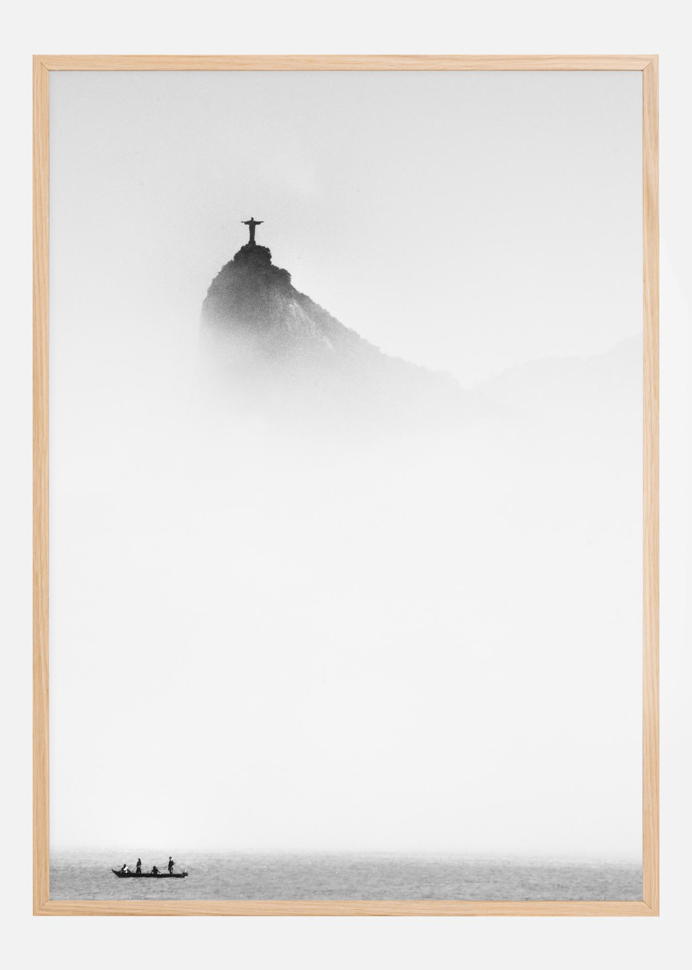 Religijny plakat z posągiem Jezusa na szczycie wysokiej skały. Duchowa atmosfera otacza ten obraz, podczas gdy mała łódka dryfuje daleko pod wysokim punktem. Biała mgła wypełnia obraz, pozwalając krzyżowi triumfalnie wyłaniać się z chmur.