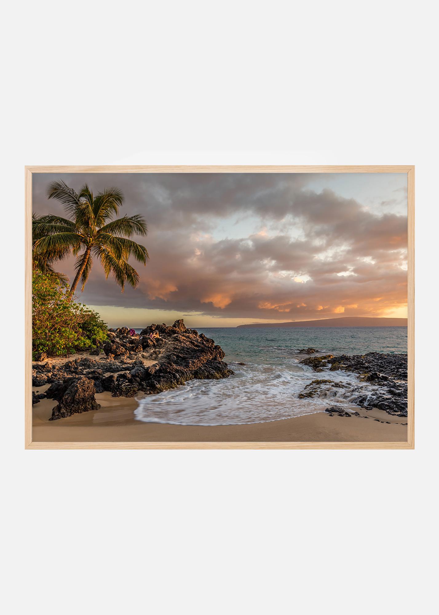 Plaża o zachodzie słońca, piękny klasyk, który jest obowiązkowy dla miłośników stylu tiki lub tropikalnego motywu. Plakat z klasyczną palmą, która pochyla się nad brzegiem plaży w ostatnich złotych promieniach słońca. Zdjęcie wygląda pięknie w ramce o postarzałym wyglądzie lub w intensywnym kolorze, aby dopasować do wystroju tiki.