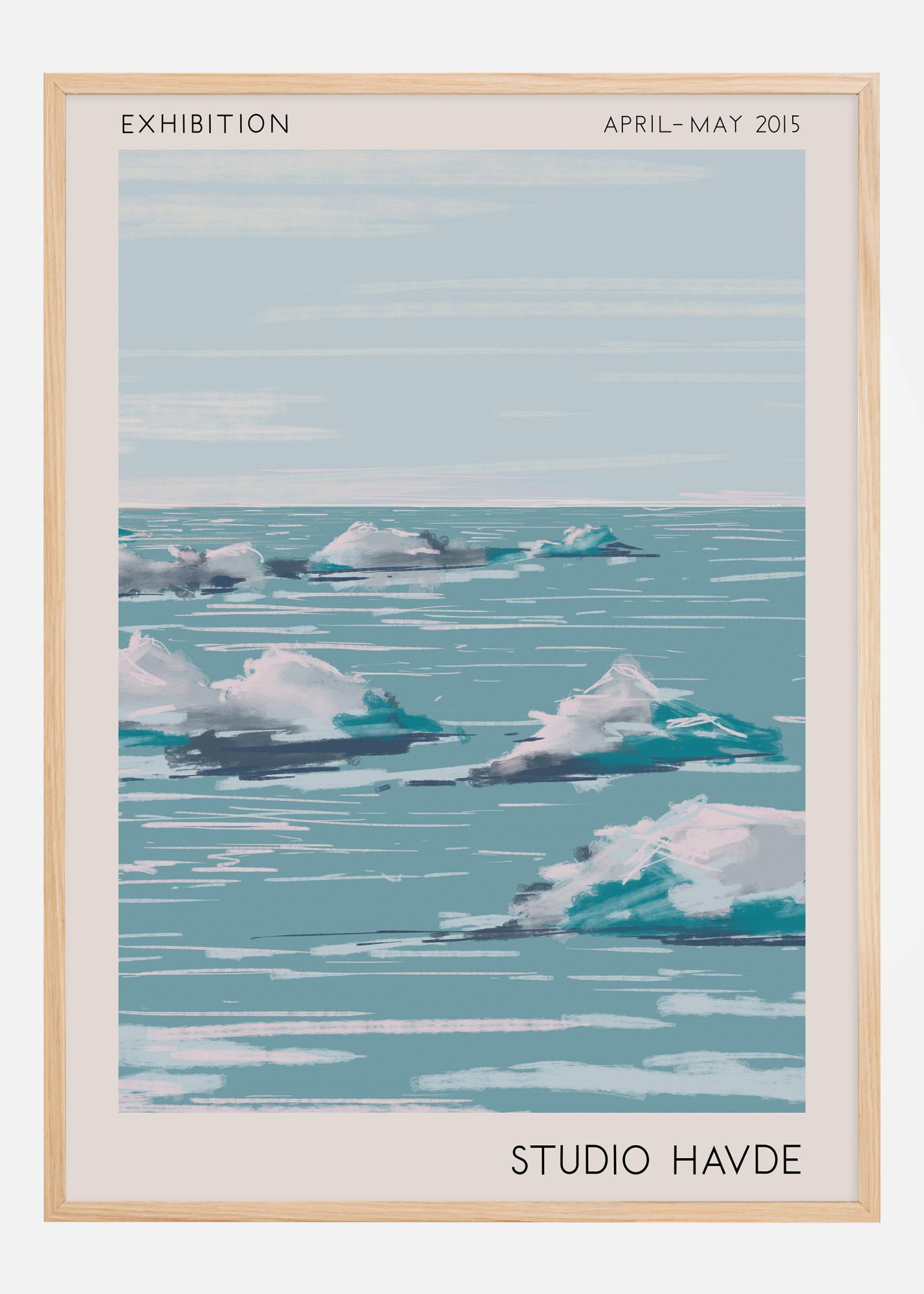 Ten spokojny i nastrojowy plakat z wystawy Studio Havde z kwietnia-maja 2015 roku przekazuje silne odczucie zmieniającej się i potężnej natury morza. Dzieło przedstawia serię lodowców przebijających się przez spokojną powierzchnię morza, namalowane w relaksującej palecie chłodnych niebieskich i miękkich białych tonów, które tworzą uczucie chłodu i spokoju w kompozycji. Ta scena arktycznego krajobrazu jest zarówno ponadczasowa, jak i aktualna, odzwierciedlając nieugiętą moc i piękno natury.