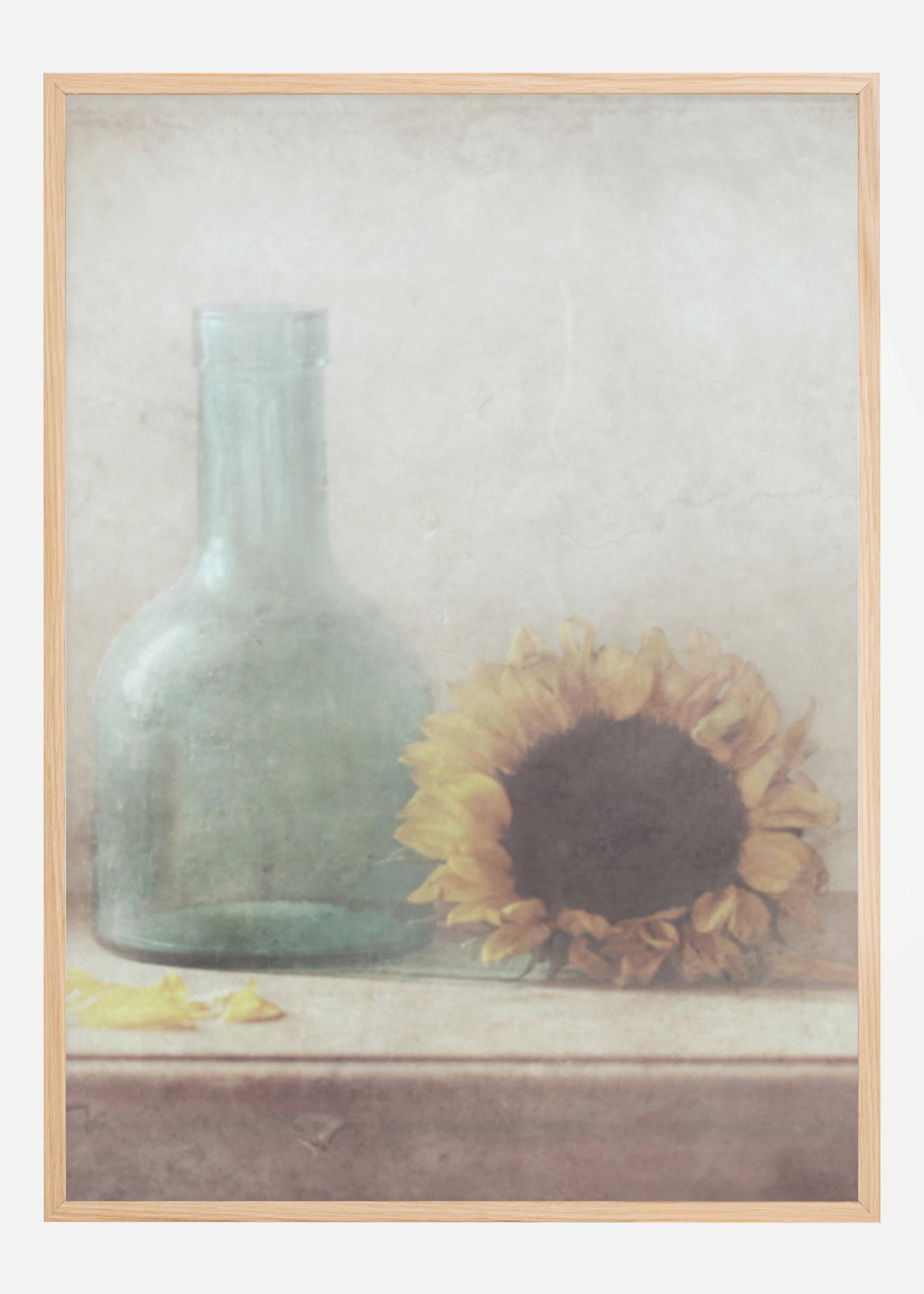 Klasyczny plakat z szklaną butelką i główką słonecznika. Zanurzony w delikatnym rozmyciu, ten kadr jest miękki i spokojny. Żółte płatki delikatnie się zginają, gdy główka kwiatu spoczywa na półce. Zawieś ten delikatny pastelowy wydruk na neutralnej ścianie, aby uzyskać kojący efekt.