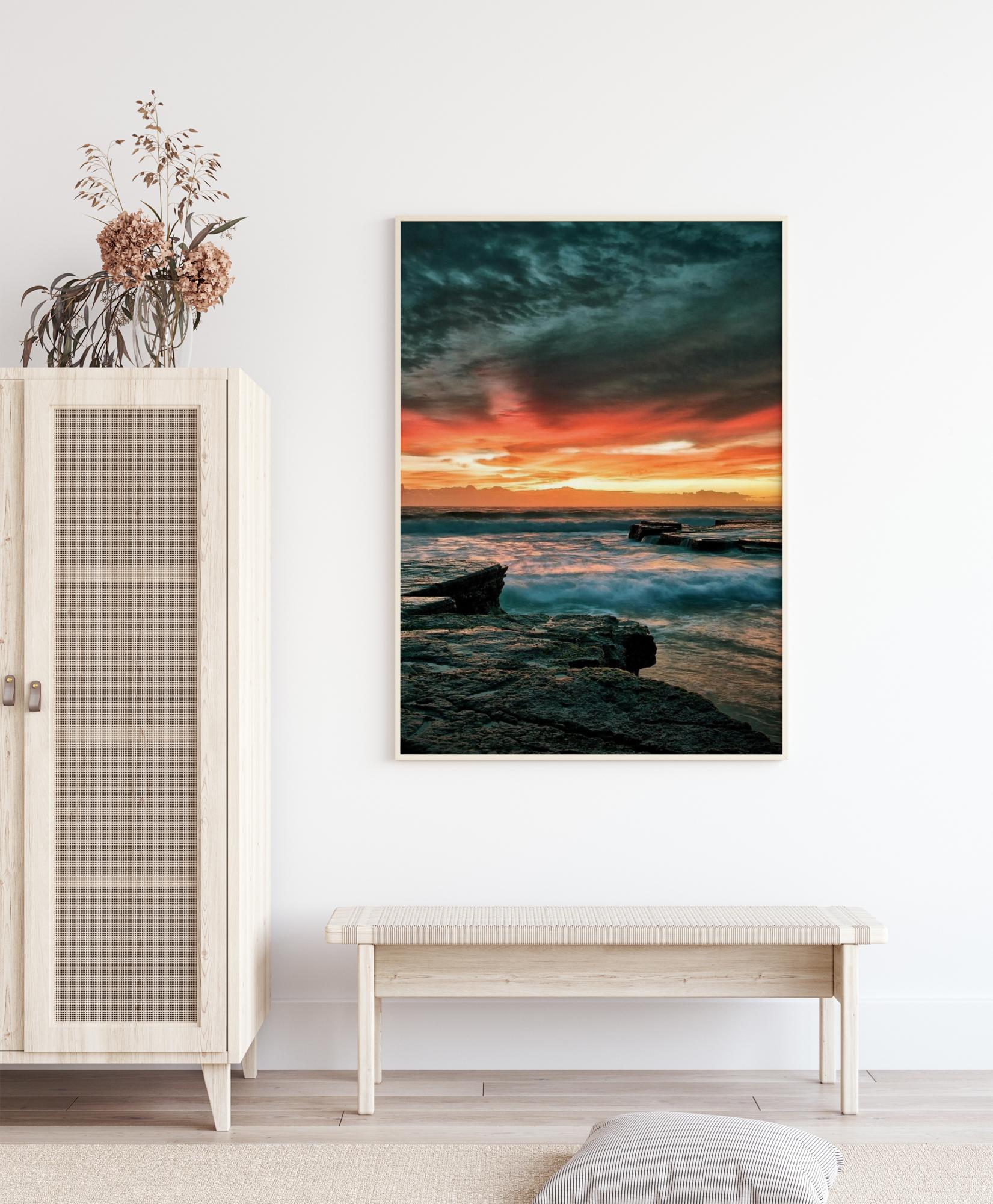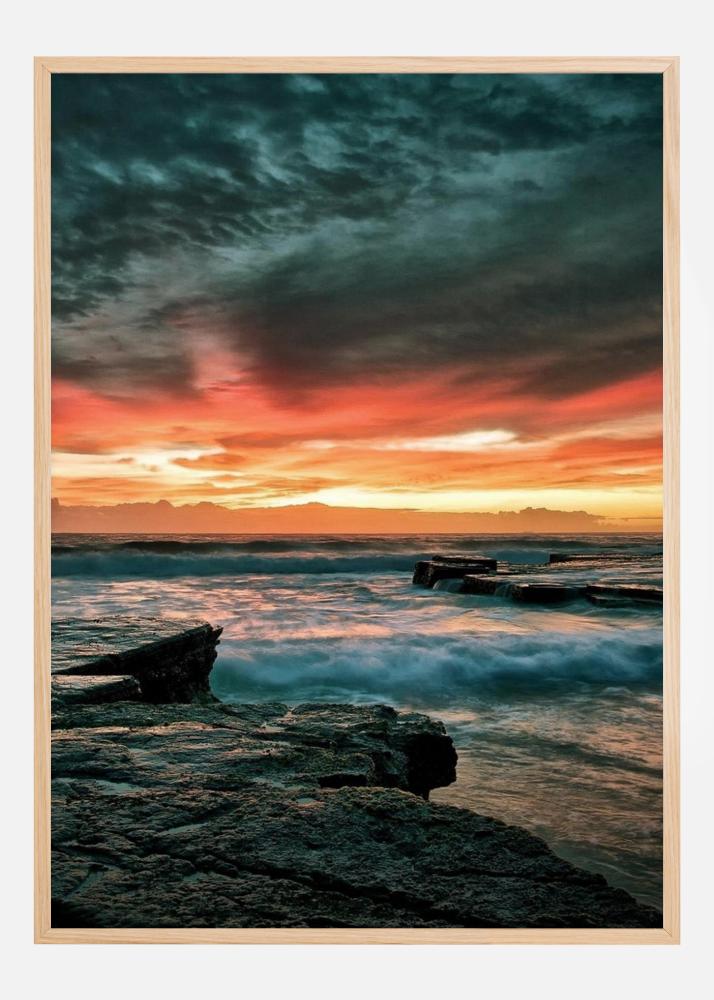 Epicki plakat z zachodem słońca nad wodą. Fale morskie uderzają o płaskie skaliste wybrzeże. Ciemne chmury znajdują się bezpośrednio nad nimi, a jaskrawoczerwony zachód słońca nisko na horyzoncie tworzy dramatyczny i imponujący obraz, który przyciągnie Twoją uwagę.