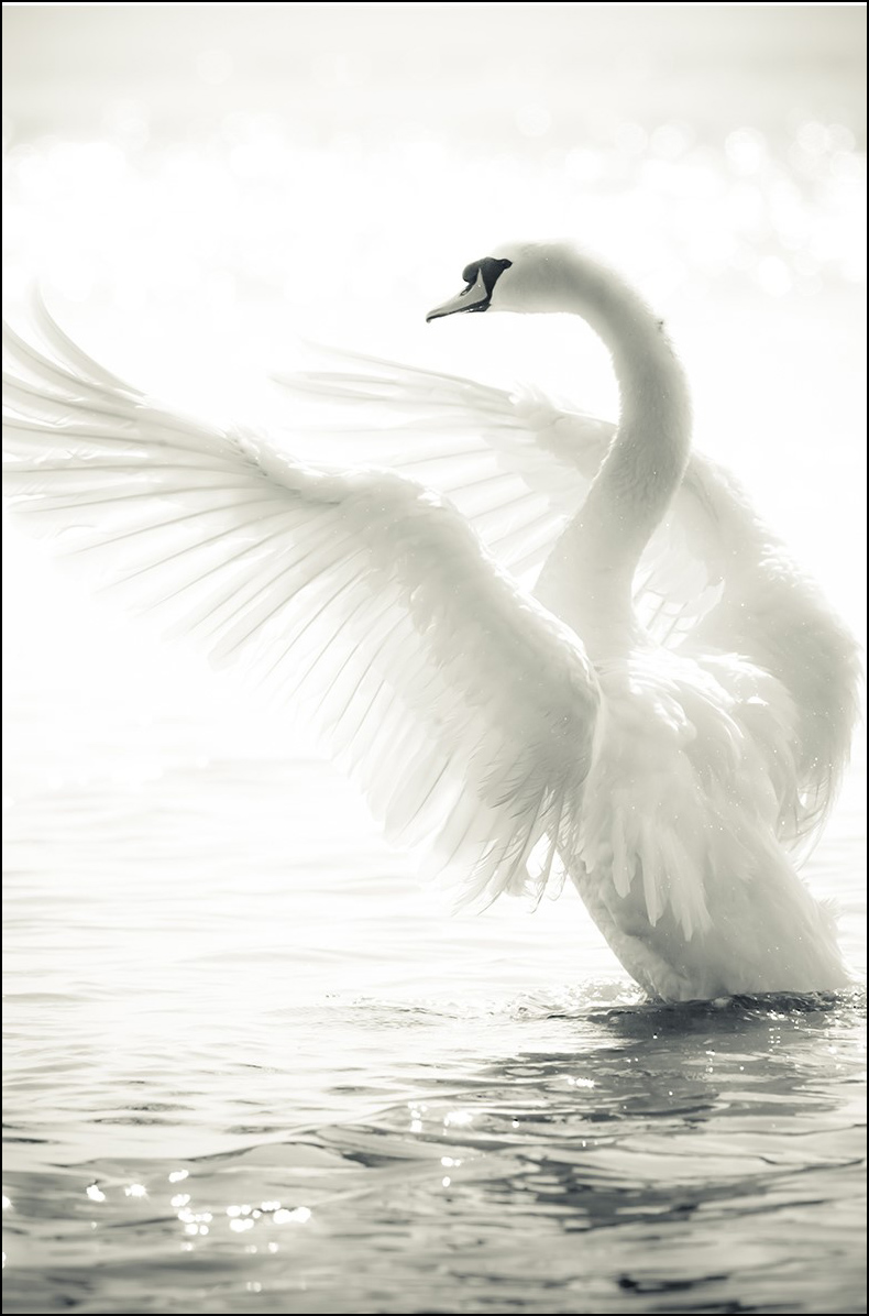 Piękne czarno-białe zdjęcie łabędzia rozpościerającego skrzydła ku niebu i cieszącego się słońcem. Plakat ma elegancki i spokojny charakter, który pasuje zarówno do pokoju dziecięcego, jak i pozostałych pomieszczeń w domu. Motyw ten sprawdzi się również w przestrzeni publicznej, stanowiąc coś atrakcyjnego do spoczęcia oka.