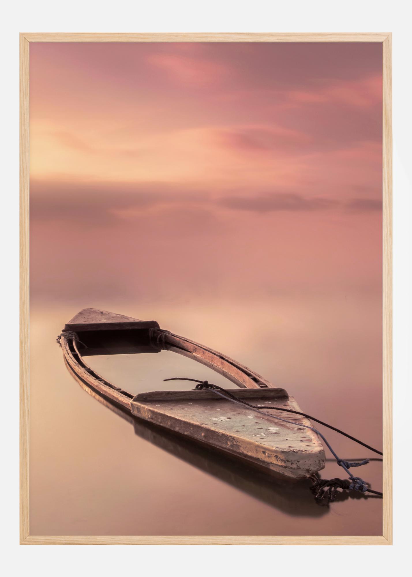 Spokojny plakat z drewnianą łodzią leżącą na spokojnej wodzie. Woda i niebo mają delikatne różowe i fioletowe pastelowe kolory. Zlewają się ze sobą, sprawiając, że woda i niebo łączą się i trwają w nieskończoność. Łódź jest jedynym stałym obiektem jako punkt skupienia w tym delikatnym, uspokajającym obrazie.