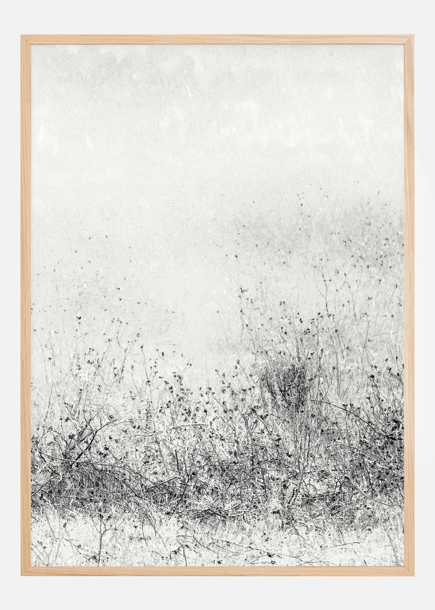 Artystyczny plakat z nieskończonymi polami traw w czerni i bieli. Postrzępione kropki i linie sprawiają, że wygląda to jak splątany, gęsty gąszcz trawy i krzewów jeżyn. Przypomina malarstwo Jacksona Pollocka ze swoimi dziwnymi bazgrołami. Linij ustąpijają wyraźnie i jasno na białym tle.
