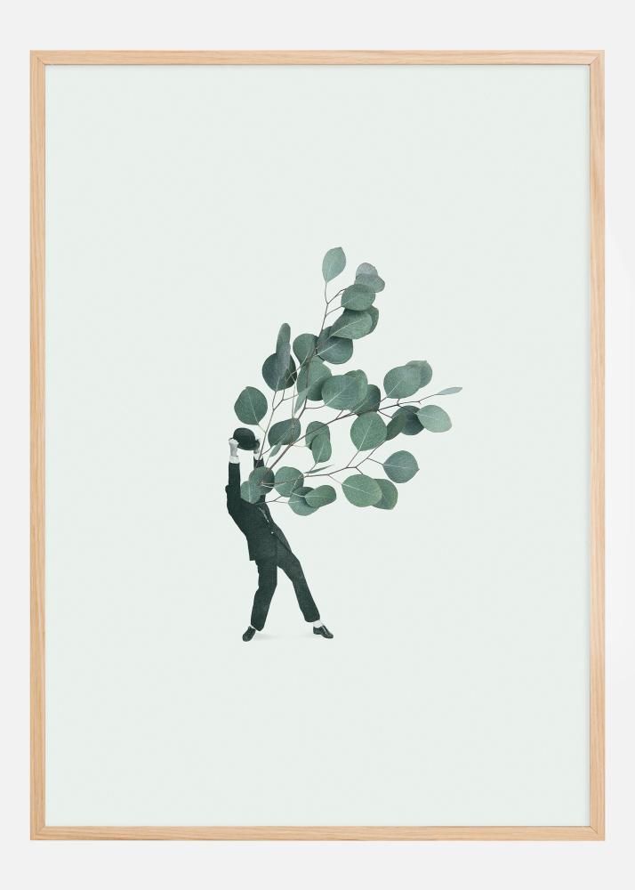 Ten artystyczny i stylowy plakat przedstawia minimalistyczny zarys osoby niosącej bujny bukiet z liści eukaliptusa, wizualny wyraz, który jest równie prosty, co potężny. Czarny kontur sylwetki na jasnym tle kontrastuje z miękkimi zielonymi odcieniami liści eukaliptusa, tworząc poczucie spokojnej natury w harmonii z ludzką obecnością.