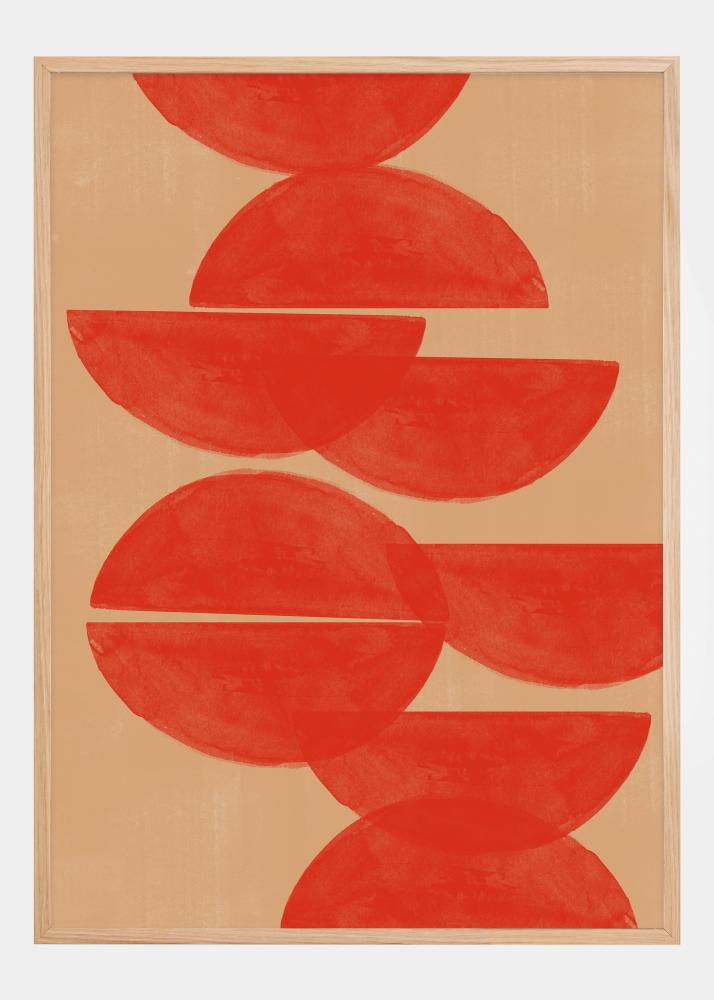 Ten żywy i fascynujący plakat stanowi odważne wyrażenie dzięki nachodzącym na siebie półkolom w głębokiej, czerwonopomarańczowej palecie. Motyw, który z natury jest geometryczny, powtarza półkola w niemal rytmiczny sposób, tworząc poczucie ruchu i dynamiki na uspokajającym beżowym tle. To wydruk, który oferuje współczesny akcent i energiczne skupienie dla każdego pomieszczenia, w którym się znajduje.