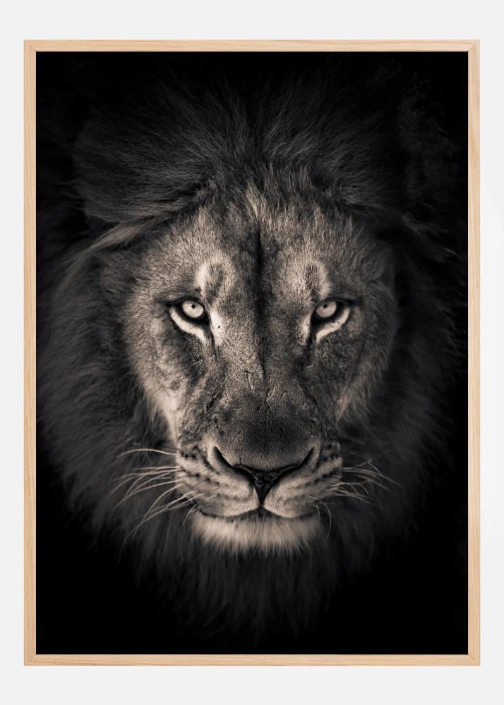 Ten potężny i poruszający plakat uchwyca głębokie spojrzenie lwa, co daje poczucie jego siły i obecności. Czarnobiała tonacja nadaje obrazowi ponadczasową jakość i podkreśla majestatyczne cechy lwa oraz intensywność jego oczu. Jest to wydruk, który emanuje autorytetem i dzikością, idealna reprezentacja 'króla dżungli'.