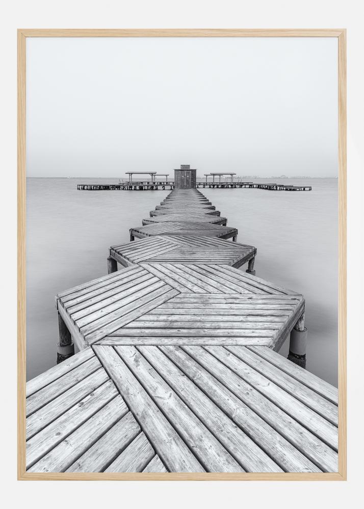 Zabawny plakat z sześciokątnym molem przemierzającym odległości nad spokojnym jeziorem. Obrazek jest w stonowanych odcieniach szarości, co sprawia, że wygląda na zimny, a nie ciepły. Drewniane molo prowadzi cię w dal, gdzie czeka na ciebie pomost. Połącz z jasnym kolorem, aby dodać ciepła.