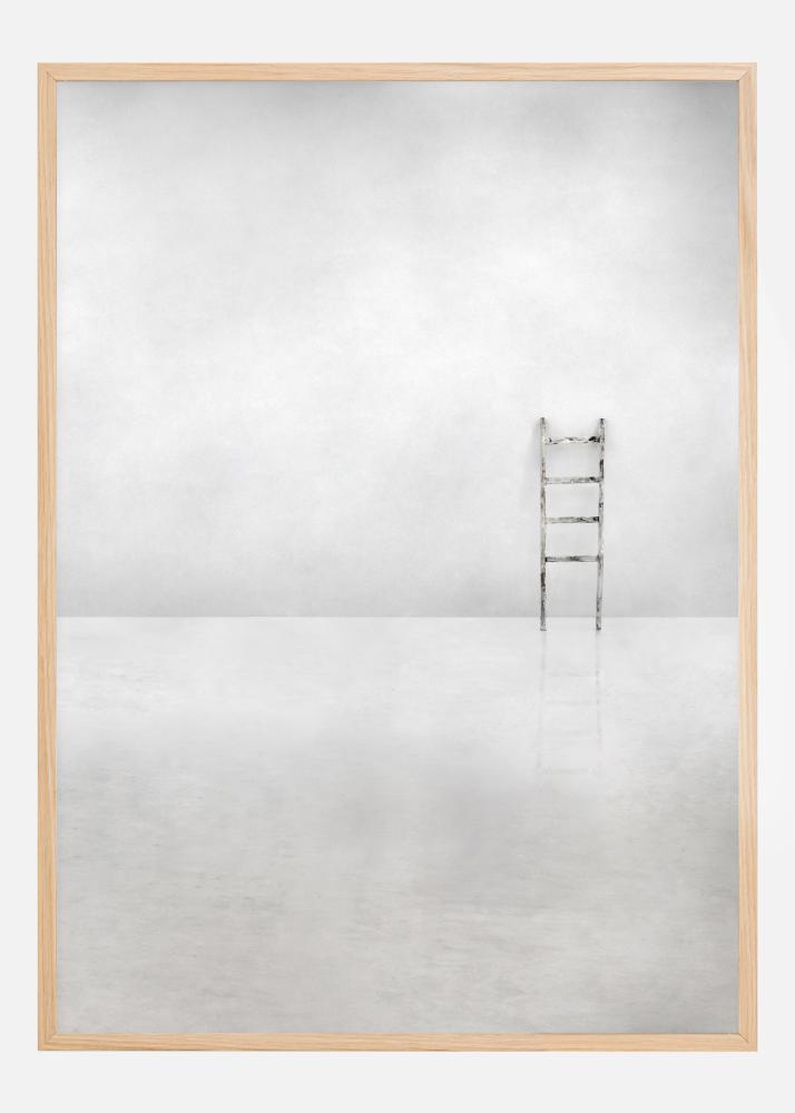 Minimalistyczny plakat z drabiną opartą o białe tło. Ta samotna drabina, zwana drabiną społeczną, jest również umieszczona na białej podłodze. Zarówno ściana, jak i podłoga są w tych samych białych i szarych tonach, co sprawia, że drabina jest wyraźnie zaznaczona w ciemniejszych odcieniach. Baw się dobrze, interpretując znaczenie tego obrazu.