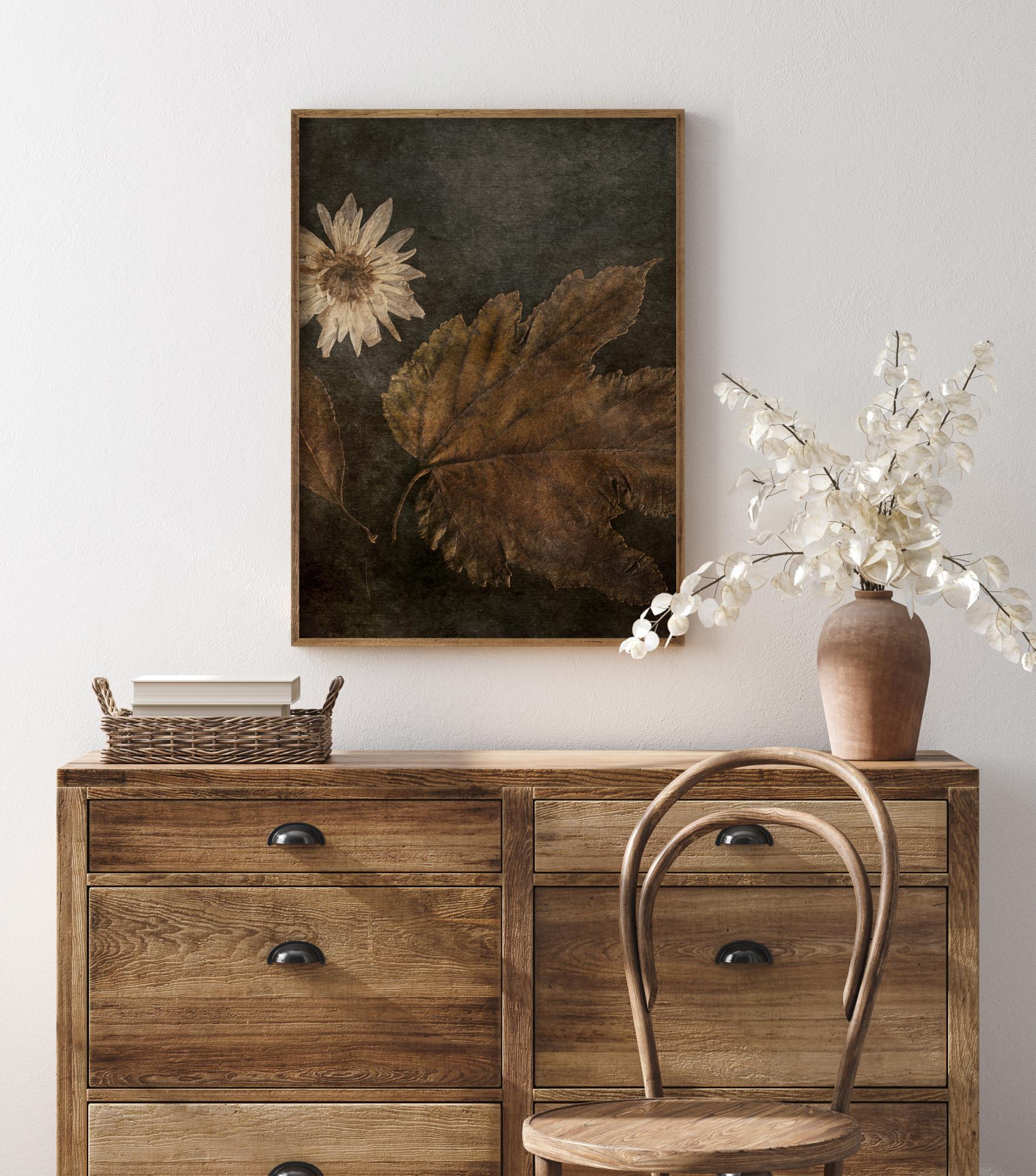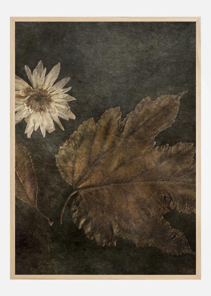 Plakat z kwiatem przedstawiający prosty kwiat z dwoma liśćmi. Biały, gwiaździsty kwiat przyciąga wzrok, wyróżniając się na ciemnoszarym tle. Dwa brązowe jesienne liście flankują go, jeden prosty owalny i jeden bardziej skomplikowany liść figowy. Przyjrzyj się uważnie, aby dostrzec detale w liściach i płatkach tego wspaniałego botanicznego druku.