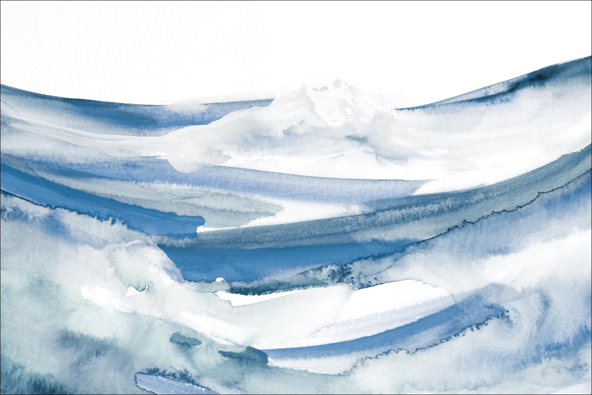 Fantastyczny jasny plakat z dużymi pociągnięciami pędzla w odcieniach niebieskiego i białego. Te dramatyczne pasy kolorów tworzą iluzję fal na morzu. Miękkie akwarelowe krawędzie tworzą pianę i nadają dziełu silne poczucie dynamiki, gdy kolor wiruje wokół. Dodaj swoim ścianom poczucie ruchu dzięki temu płynnemu dziełu.