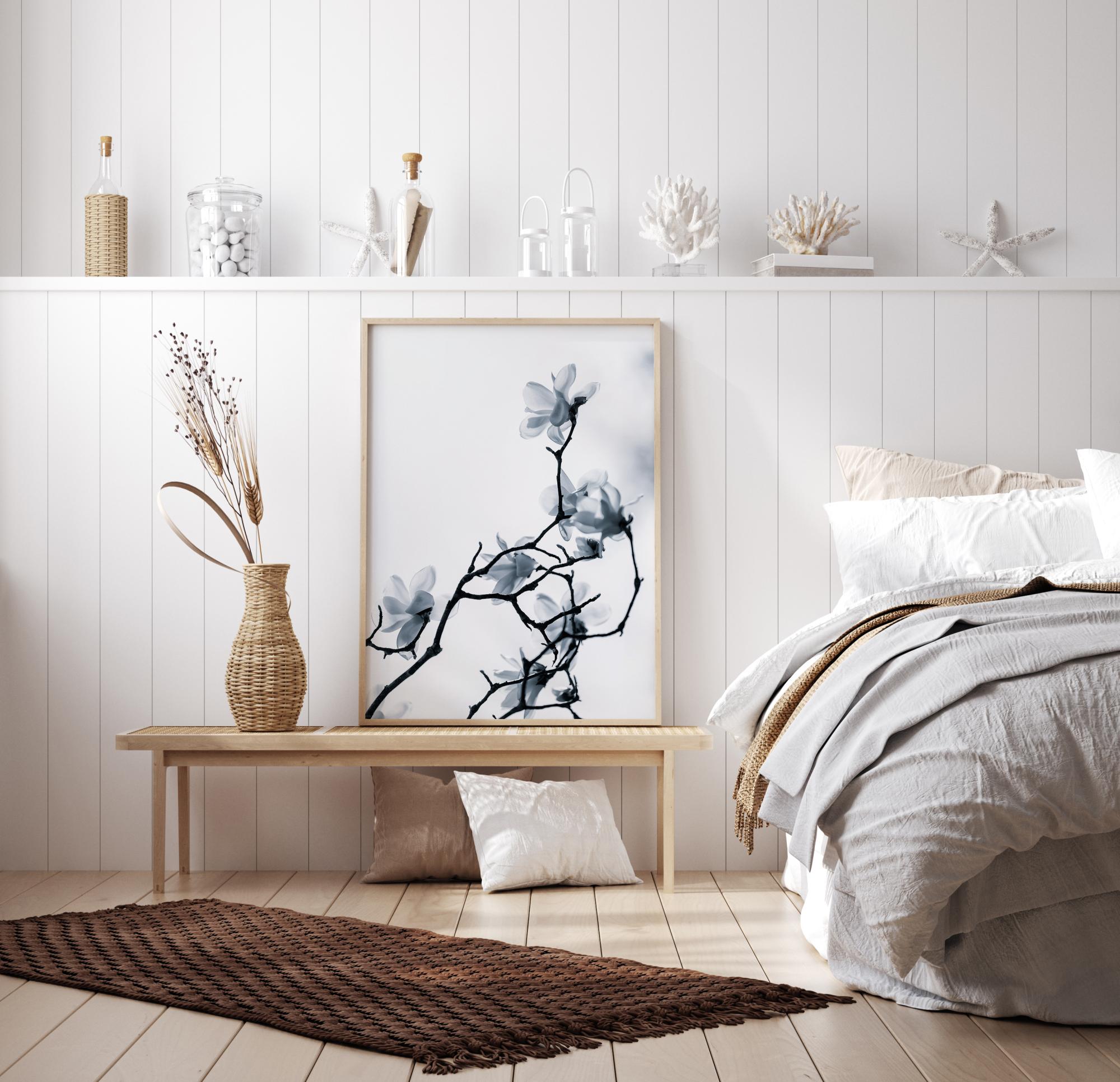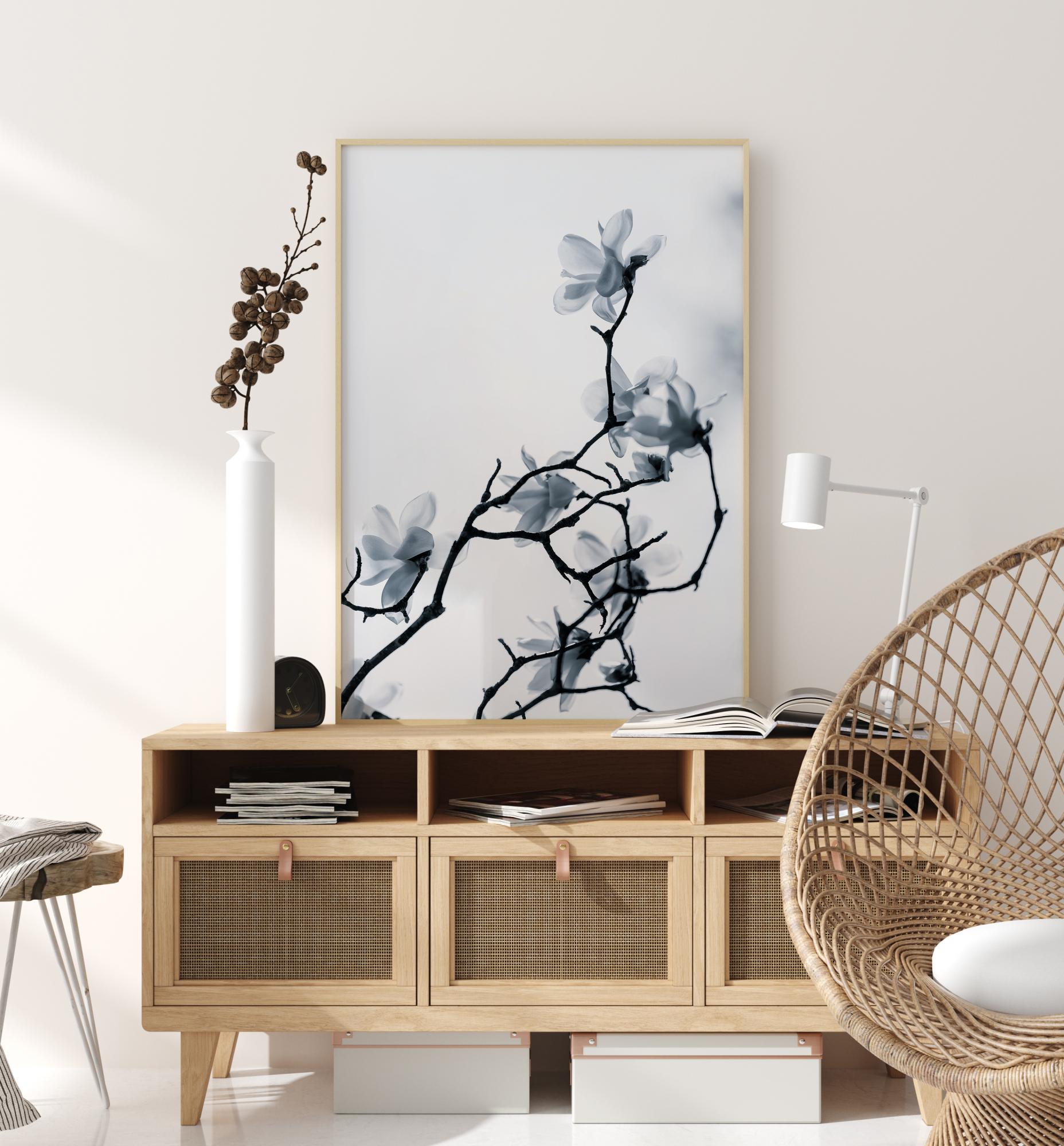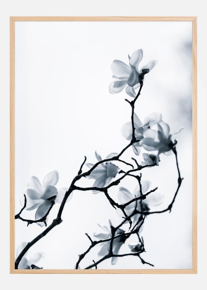 Plakat z kwiatami przedstawiający wdzięczną gałąź pełną delikatnych kwiatów. Cienkie gałęzie są czarne na tle białego nieba i unoszą się do góry, każda z nich nosi delikatny biały kwiat. Spokój i cisza emanują z tego obrazu, który doskonale pasowałby jako dodatek do łazienki lub prostej ściany w korytarzu.
