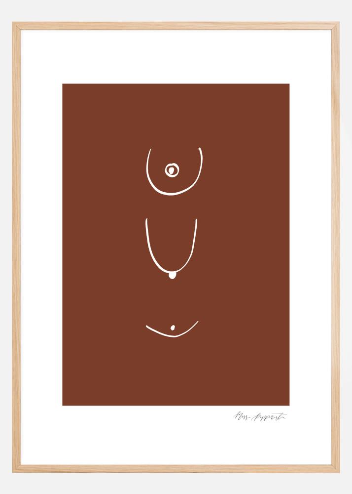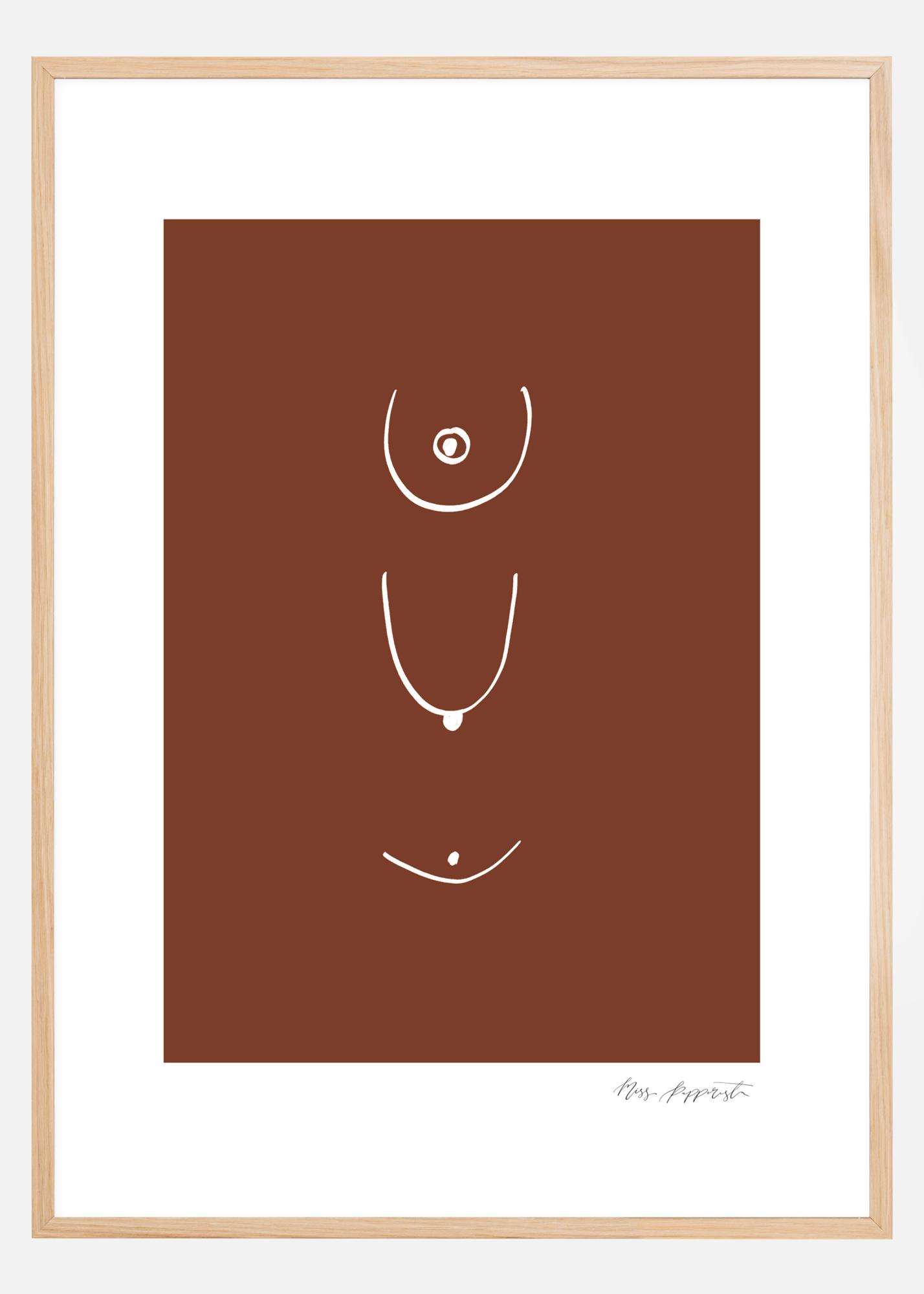 Abstrakcyjny plakat z białymi zakrzywionymi liniami i kropkami na prostej brązowej tle. Linie mogą być interpretowane według własnych upodobań, ale wyglądają jak kobiece piersi rysowane z różnych kątów. Ciesz się lekko dziwnym charakterem tego prostego obrazu.