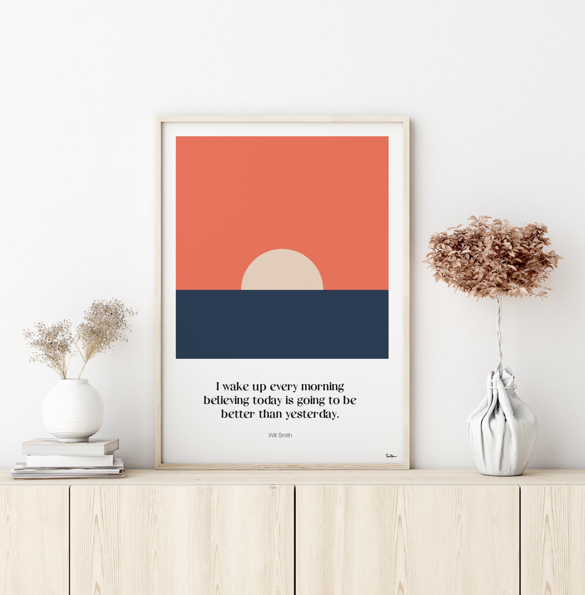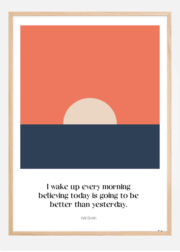 Plakat z cytatem Willa Smitha "Budzę się każdego ranka wierząc, że dziś będzie lepszy niż wczoraj" napisanym pod graficzną ilustracją wschodu słońca. Elegancki i stylowy plakat stworzony przez Tima Hanssona.