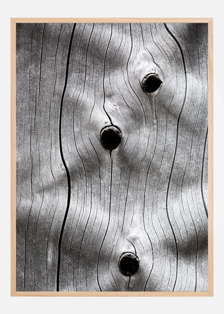 Plakat makro przedstawiający pień drzewa z trzema dziurami. Słoje drewna są wyraźne, gdy linie pnia wiją się ku górze. Trzy ciemne dziury otwierają się w różnych miejscach wzdłuż tych linii, nadając pniowi poczucie tekstury. Powieś ten obraz na zielonej ścianie, aby uzyskać bardziej naturalne odczucie.