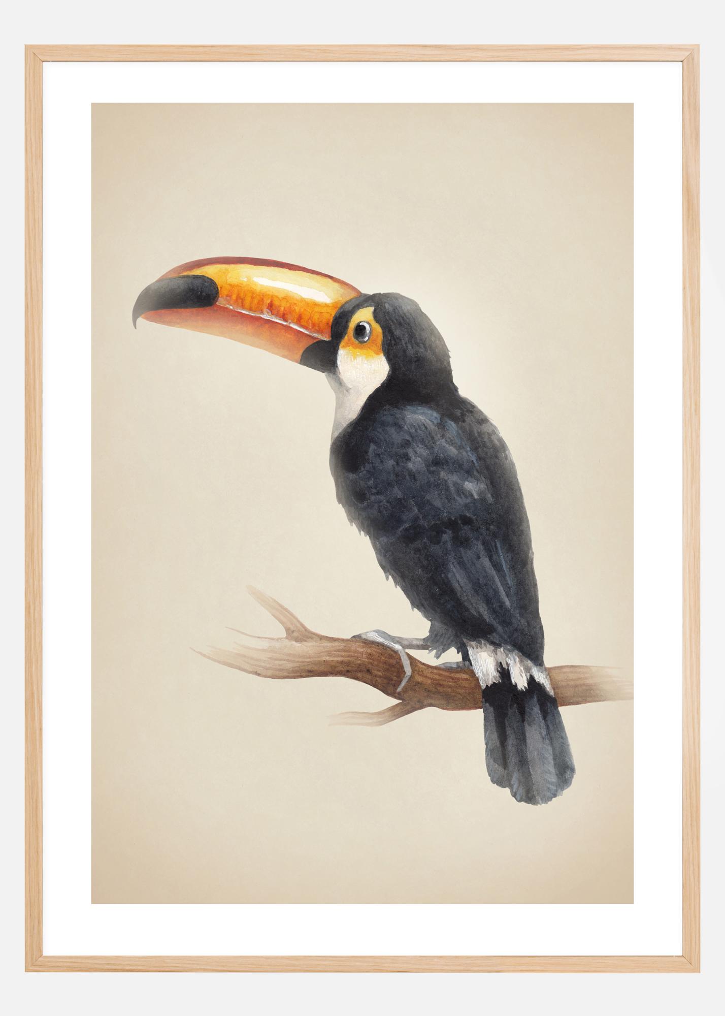 Uroczy plakat portretowy z dużodziobym tukanym. Ten obraz ptaka ma jaskrawożółty dziób, który wyróżnia się na szarym tle. Z lekko odwróconymi plecami, ten ptak błyszczy swoimi błyszczącymi czarnymi piórami na tym prostym obrazie. Połącz z innym plakatem z tropikalnymi ptakami, aby stworzyć idealny zestaw.