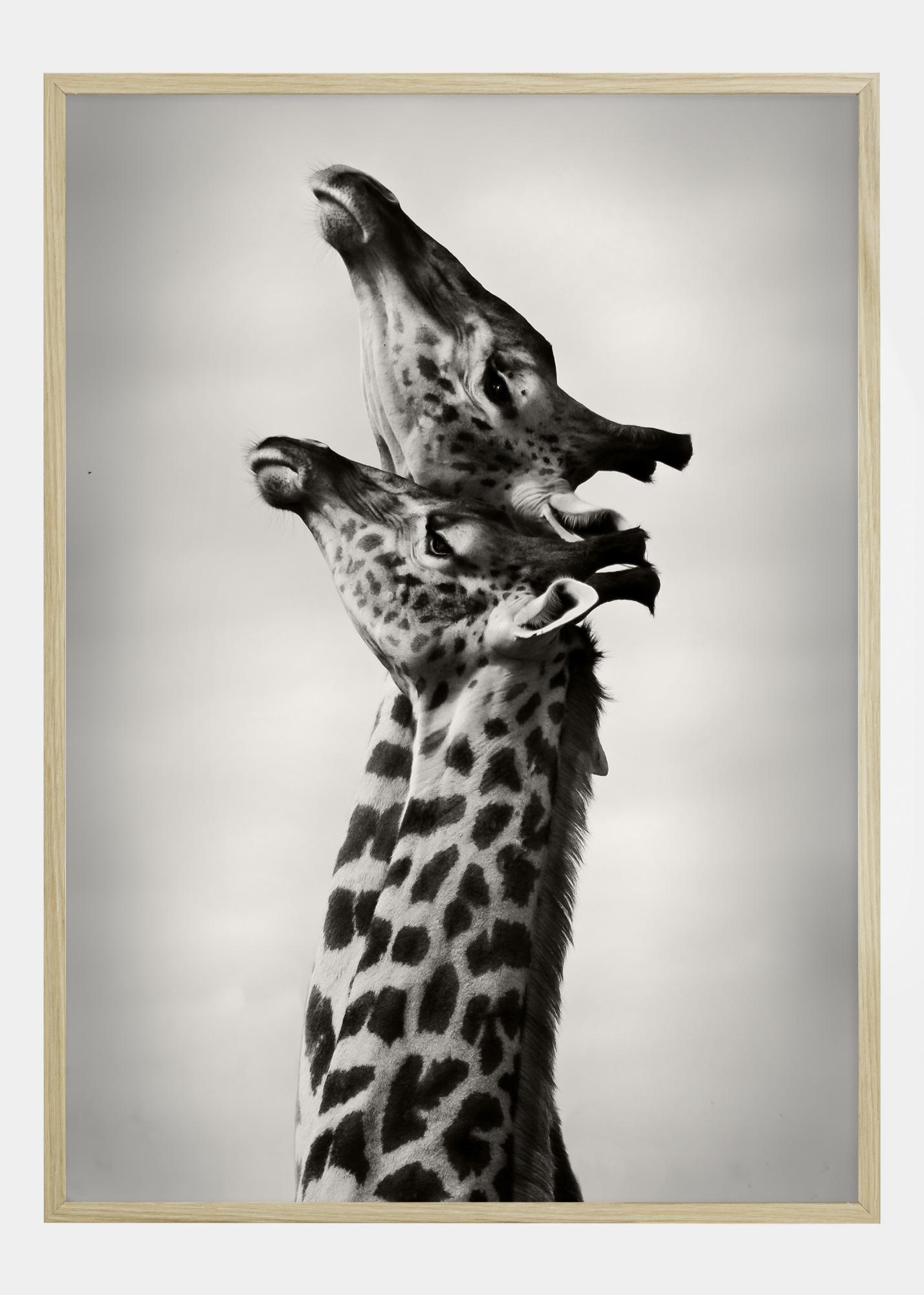 Plakat ukazuje uroczy moment między dwiema żyrafami, które zdają się dzielić czułą interakcję, ich szyje elegancko wygięte ku sobie. Obraz został uchwycony w czerni i bieli, co podkreśla ikoniczne wzory na skórze żyraf i tworzy silny kontrast wizualny z miękkim tłem nieba.