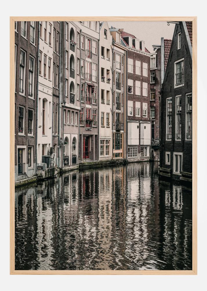 Plakat miasta z kanałem biegnącym przez rzędy wysokich kamienic. Ten druk w sepii ma tylko kilka odcieni czerwieni i miękkie brązowe kolory, które tworzą punkty centralne. Domy spoczywają na brzegu wody i rzucają swoje cienie na szemrzącą powierzchnię. Znajdź pasujące beżowe kolory na ścianie, aby podkreślić kolory domów.