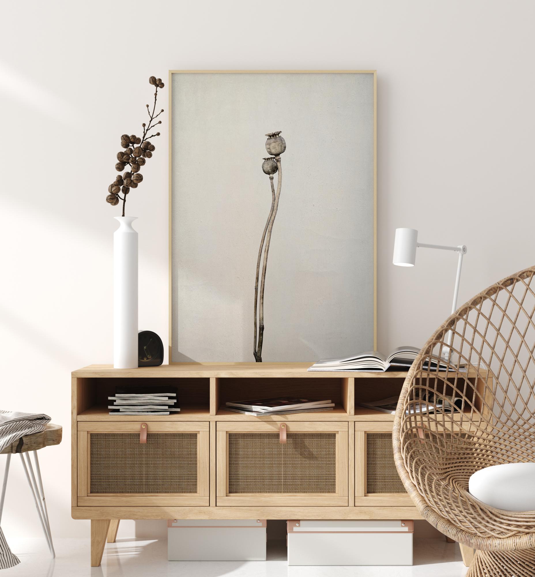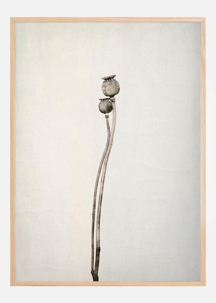 Plakat z motywem kwiatowym z dwoma makowymi torebkami nasiennymi splecionymi w taniec. Czarno-białe zdjęcie przedstawia te dwie długonogie torebki nasienne maku wijące się na tle białego tła. Ten elegancki taniec przyciąga uwagę, gdy te makowe główki przygotowują się do pęknięcia i rozprzestrzenienia swoich nasion, aby hodować nowe kwiaty.