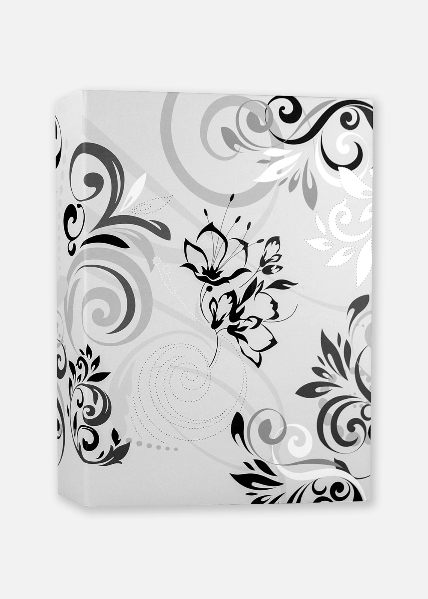 Album ma solidne okładki z eleganckim kwiatowym wzorem w kolorze czarnym i szarym. To dekoracyjny album na zdjęcia, który świetnie wygląda zarówno na półce, jak i na widoku.