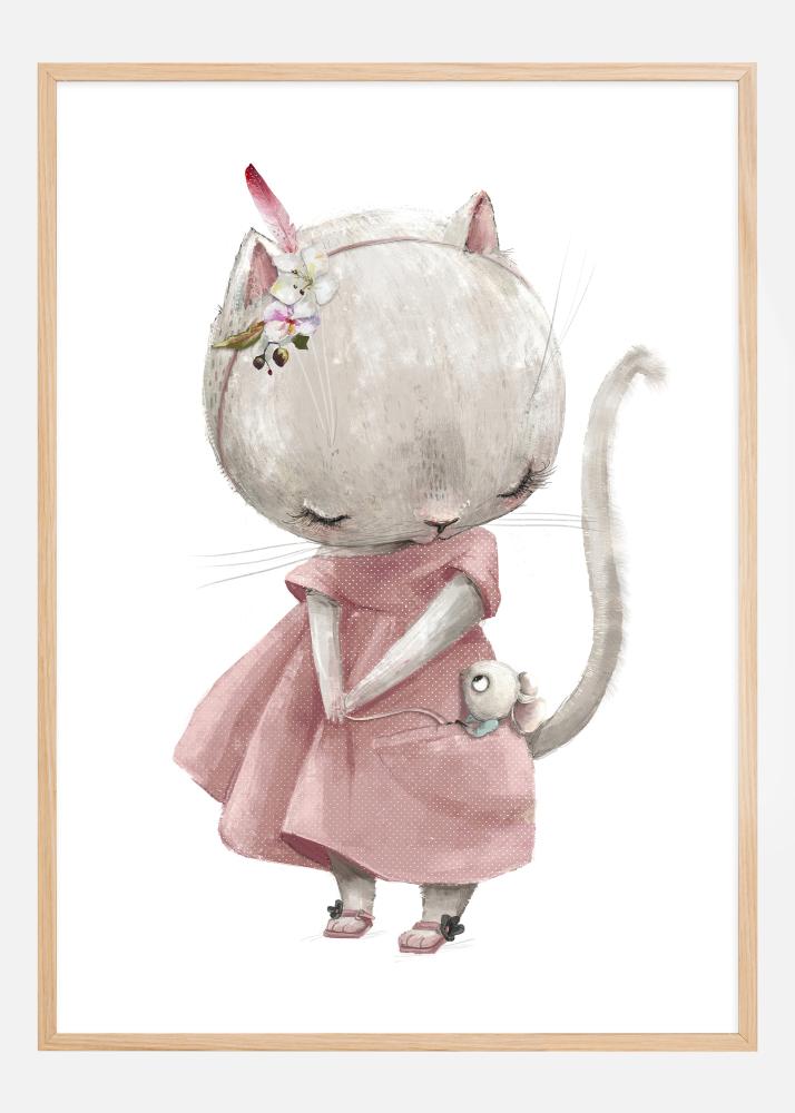 Ten uroczy plakat przedstawia słodką scenę niezwykłej przyjaźni; mała mysz spoczywająca bezpiecznie w ramionach kota, obaj ubrani w świąteczne stroje. Kot jest pięknie ubrany w różową sukienkę, z elegancką kwiatową dekoracją na głowie. Delikatne malowanie akwarelą nadaje zwierzętom miękkość i ciepło, które promieniuje przyjaźnią i zaufaniem.
