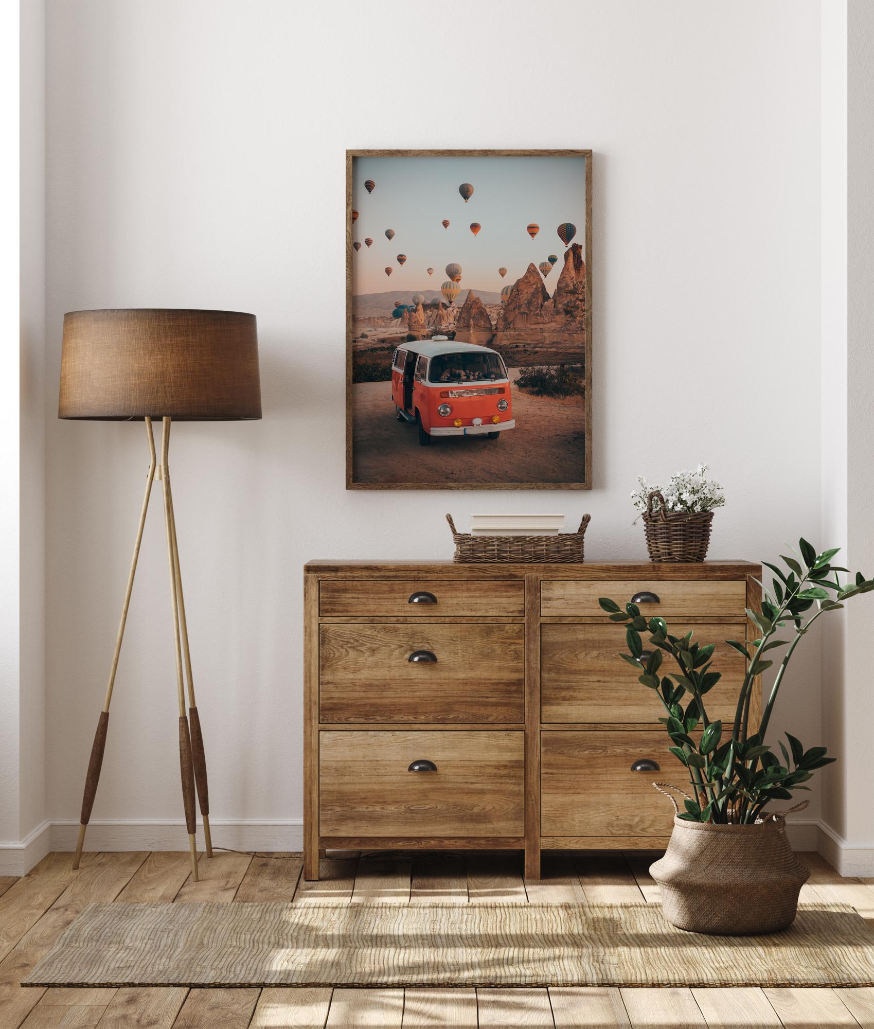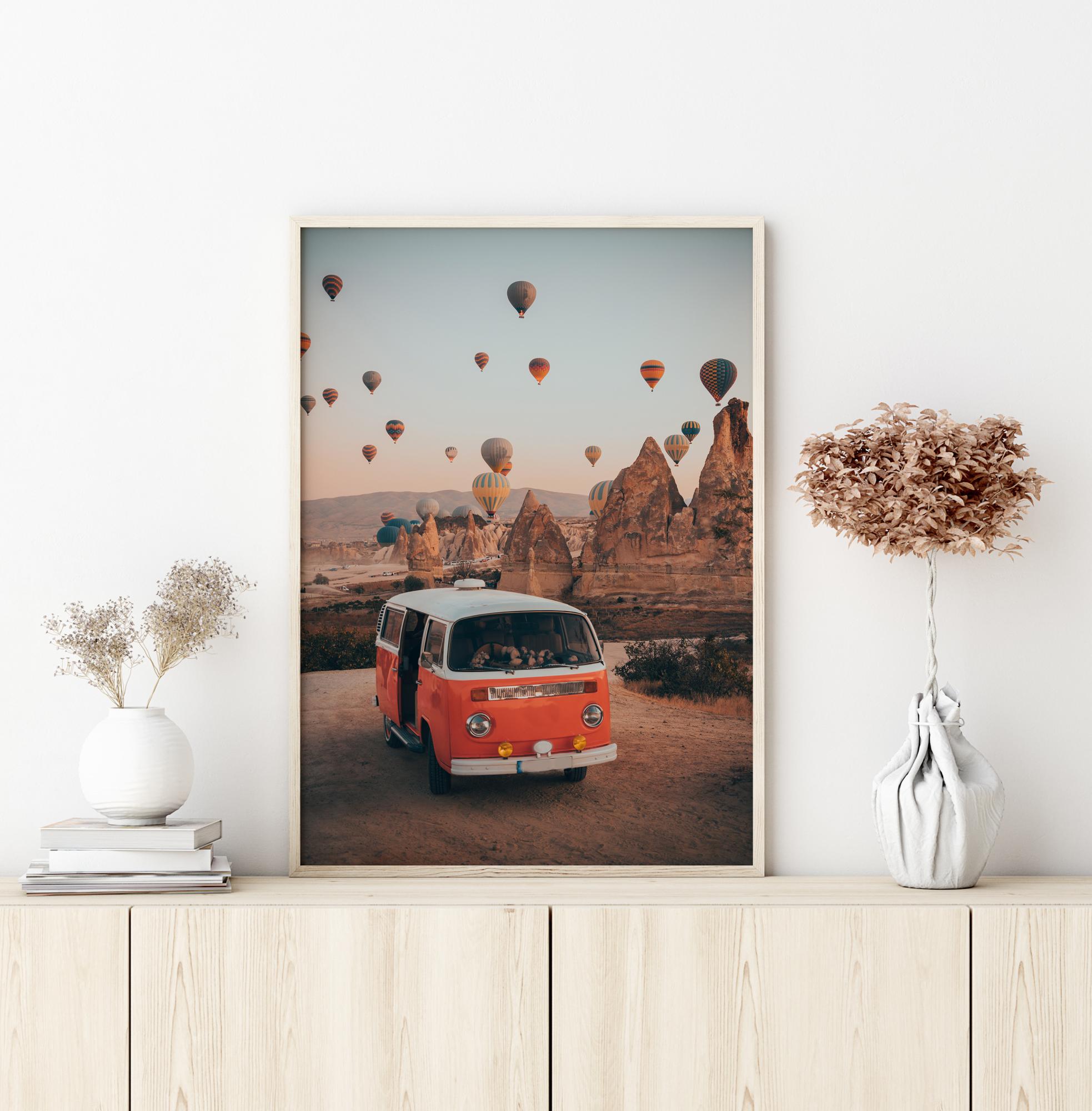 Plakat krajobrazowy z interesującymi formacjami skalnymi i balonami na gorące powietrze unoszącymi się ponad szczyt. Pomarańczowy bus Volkswagen z otwartymi drzwiami stoi na pierwszym planie. Kolorowe balony wypełniają niebo w tle, unosząc się ku jasnoniebieskiemu niebu na magiczną podróż.