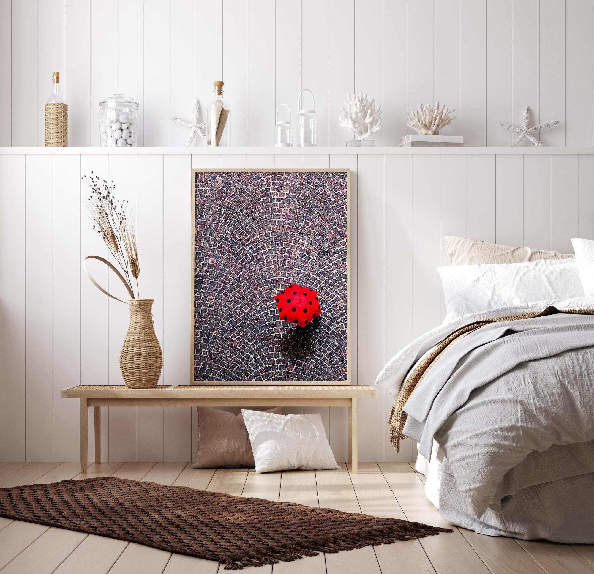 Miejski plakat z chodnikiem z perspektywy ptaka. Jasnoczerwony parasol z czarnymi plamkami tworzy jasny punkt na niebieskiej i fioletowej mozaikowej podłodze. Parasol przypominający biedronkę tworzy zabawny punkt centralny w tym wzorzystym i tessellującym obrazie.
