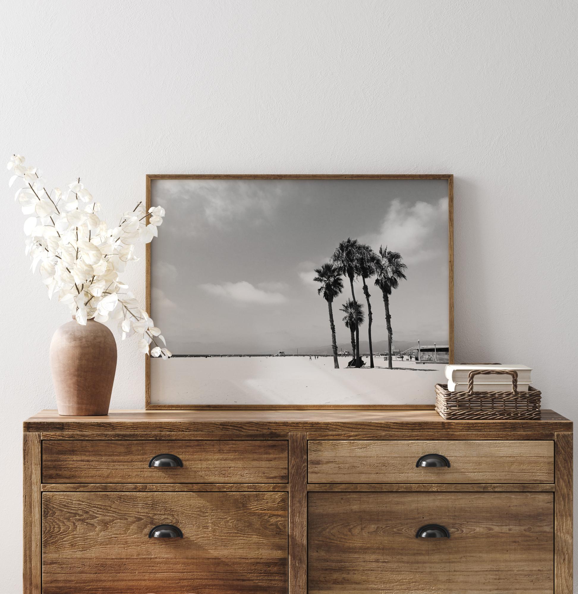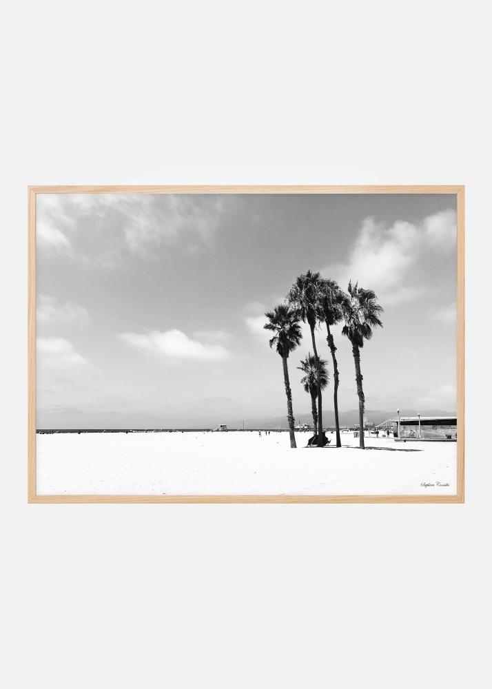 Fotograf Saphira Consilio zabiera nas tutaj na białą plażę w Wenecji. Tutaj ludzie dzielą to miejsce z pięknymi palmami, parkami rozrywki i wieżami ratowniczymi ratowników. Piękny czarno-biały plakat w formacie poziomym.