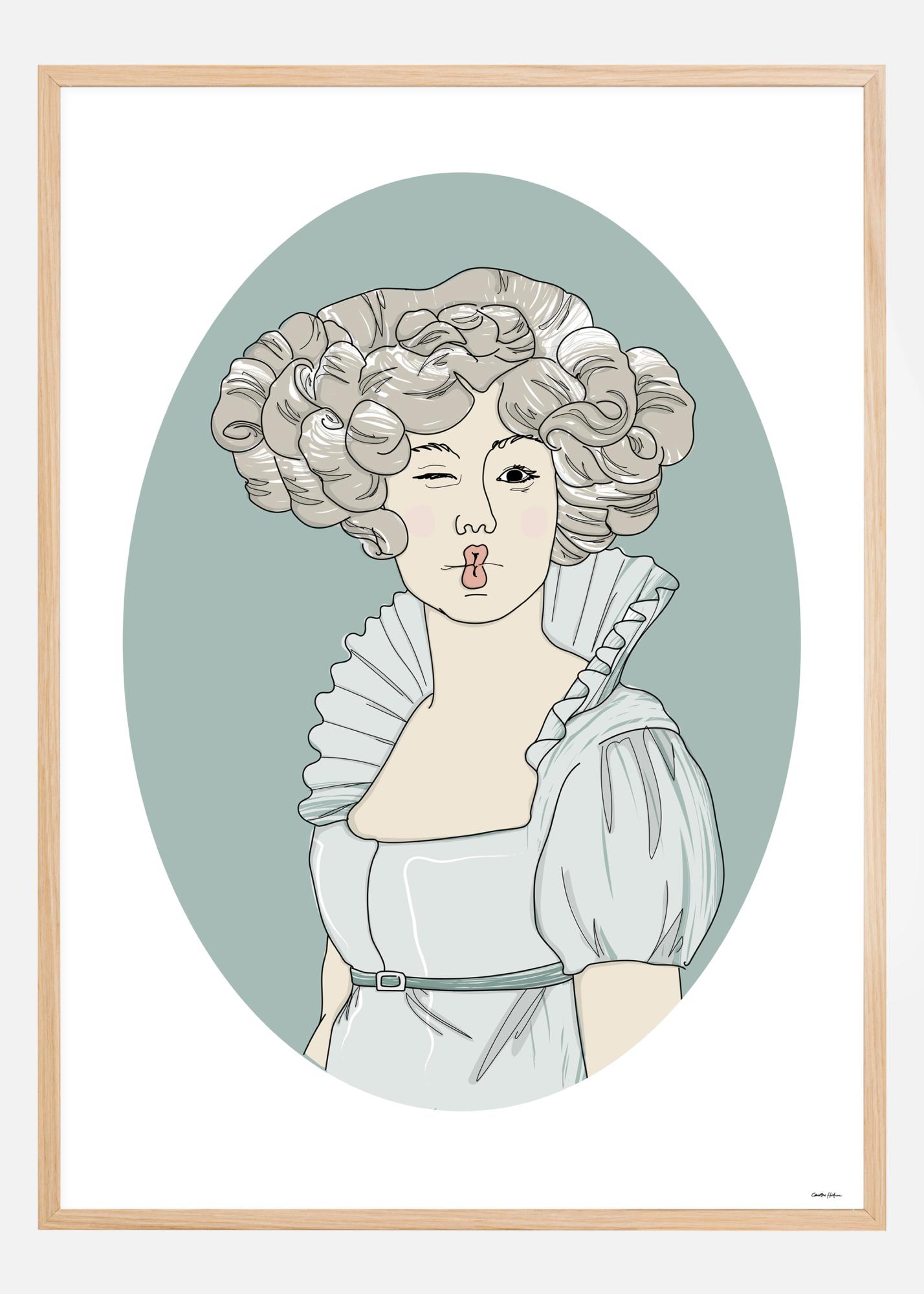 Zuchwały plakat z wiktoriańską Violettą, która nonszalancko mruga z obrazu z ustami złożonymi w pocałunek. Jej szare loki pasują do miękkiej błękitnoszarej sukienki z wysokim kołnierzem. Obraz znajduje się również w niebieskiej owalu, aby przypominać stare medalionowe zdjęcia i stworzyć unikalne, dziwaczne dzieło sztuki.