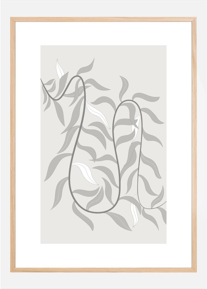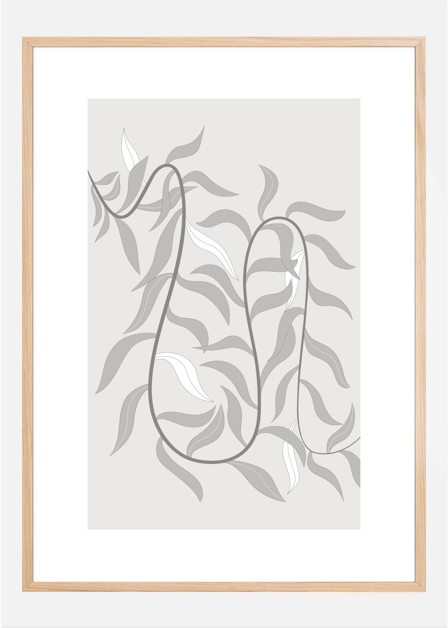 Abstrakcyjny plakat botaniczny z pnącą winoroślą wijącą się po plakacie. Projekt to prosty styl druku z liśćmi w jasnoszarym i białym kolorze. Ciemnoszara winorośl wije się między liśćmi i łączy wszystko w wijący się kształt. Połącz z miękką zieloną ścianą, aby uzyskać efekt liści.