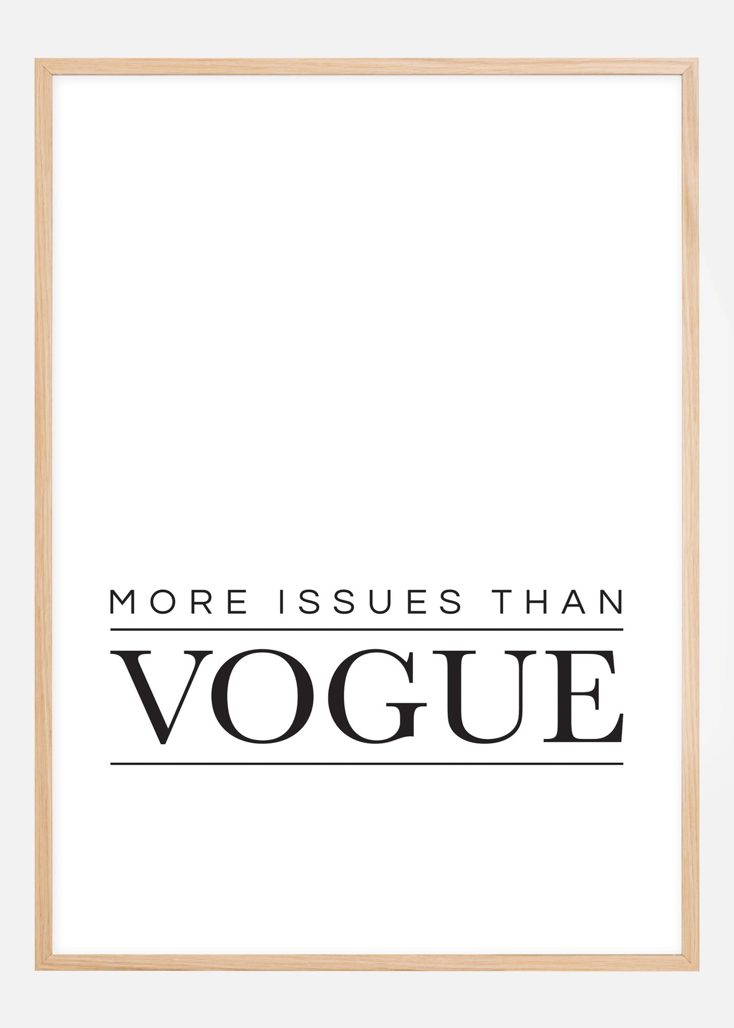 Stwórz stylową galerię obrazów w domu, korzystając z eleganckich plakatów w różnych wzorach! Prezentujemy tu minimalistyczny, czarno-biały plakat z motywem tekstowym "More issues than Vogue" oraz dwoma dekoracyjnymi liniami. Słowo "Vogue" jest napisane czcionką, która przypomina logo znanego magazynu modowego. Świetnie komponuje się ze złotą lub srebrną ramą, nadając luksusowy charakter. Dzięki dostępności plakatów w różnych rozmiarach, łatwo znajdziesz taki, który pasuje do Twojej ściany.