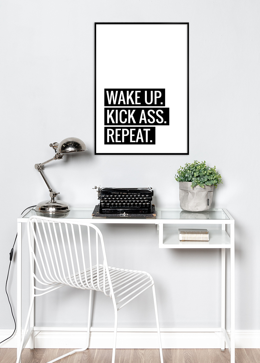 Bycie całkowicie niesamowitym każdego dnia nie zawsze przychodzi naturalnie. Nie ma się czego wstydzić! Zamiast tego zachęć się do tego, umieszczając ten śmiały plakat na ścianie. Plakat ma elegancki i prosty design z białym tłem oraz czarno-biały nadruk z tekstem ”Wake up. Kick ass. Repeat.” Dostępny w 6 różnych formatach i przedziałach cenowych. Uzupełnij chętnie czarną lub barwną ramką z naszego szerokiego asortymentu.