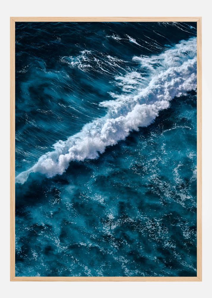 Ten dynamiczny plakat uchwyca potężną siłę morza w migawkowym obrazie łamiącej się fali. Dzięki odcieniom głębokiego morskiego błękitu i jaśniejących białych pian skumienia kontrast jest nie tylko uderzający, ale również wypełniony ruchem i życiem. Powierzchnia morza, żywa i zmieniająca się, przyciąga oko obserwatora i prowadzi przez naturalny rytm i taniec fali.