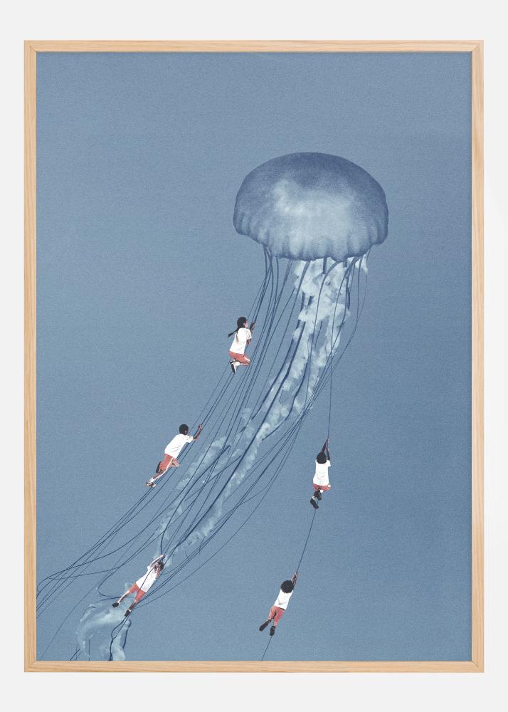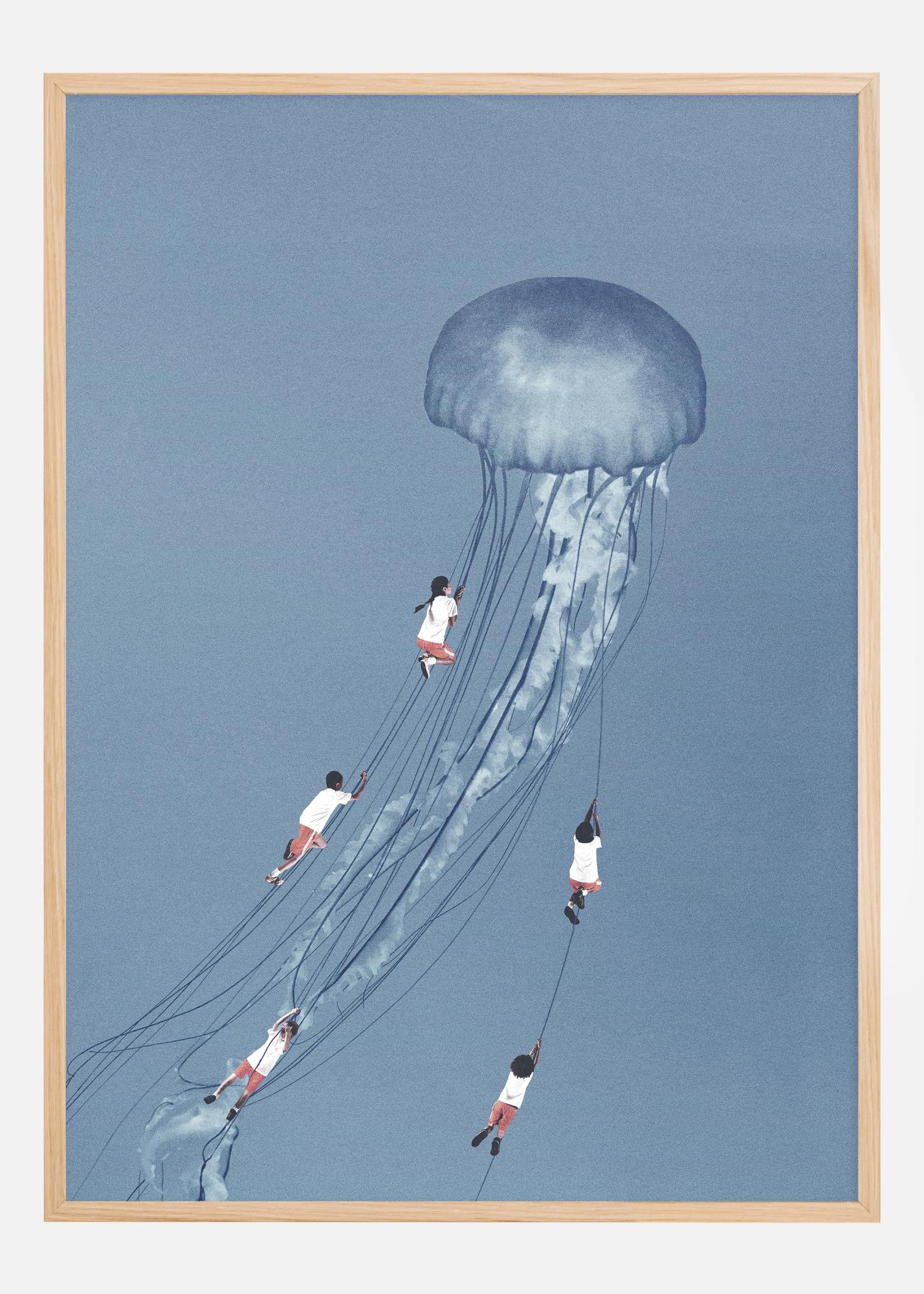 Ten poetycki i marzycielski plakat przedstawia ludzi huśtających się na mackach gigantycznej meduzy, unoszących się w nieskończonym błękitnym niebie. Ta fascynująca scena jest hołdem dla siły wyobraźni, gdzie podświadomość i świat marzeń zderzają się z jawą. Bezciężarowy taniec ludzi z meduzą symbolizuje radość, wolność i swobodną lekkość, jaką często można znaleźć w zabawnych światach dzieci.