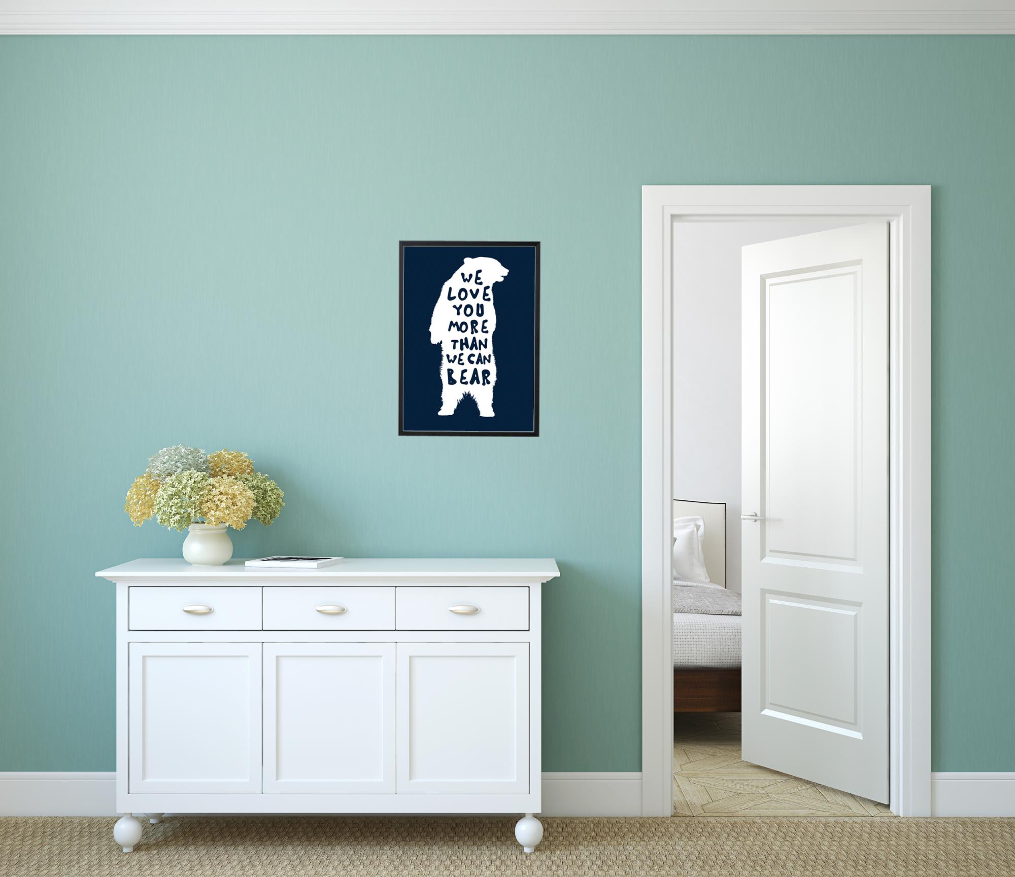 Pomysłowy i jednocześnie pełen miłości plakat, który pasuje do osób, które szczególnie lubią niedźwiedzie. Graficzny nadruk to świetny prezent dla kogoś, komu chcielibyśmy okazać wdzięczność. Plakat przedstawia sylwetkę niedźwiedzia w białym kolorze na ciemnym tle i artystyczne białe czcionki na cytacie. Opraw plakat w elegancką i prostą ramkę, która pasuje do reszty wystroju, aby stworzyć poczucie spójności w otoczeniu.