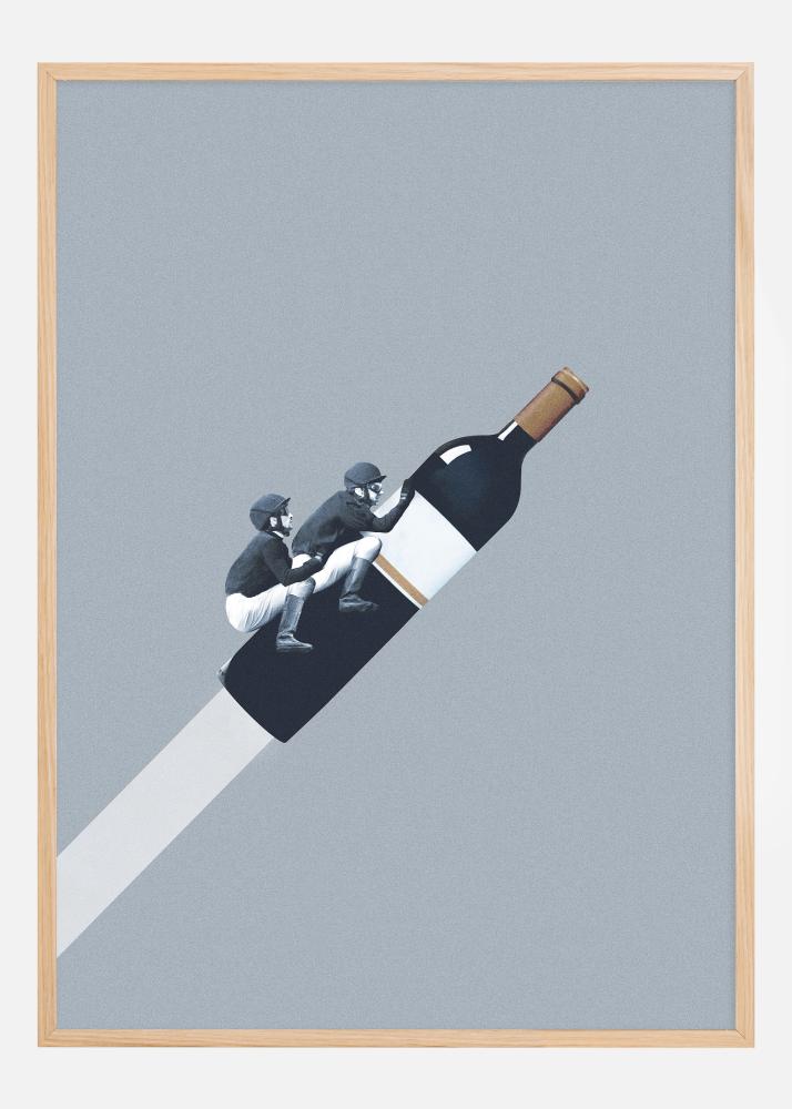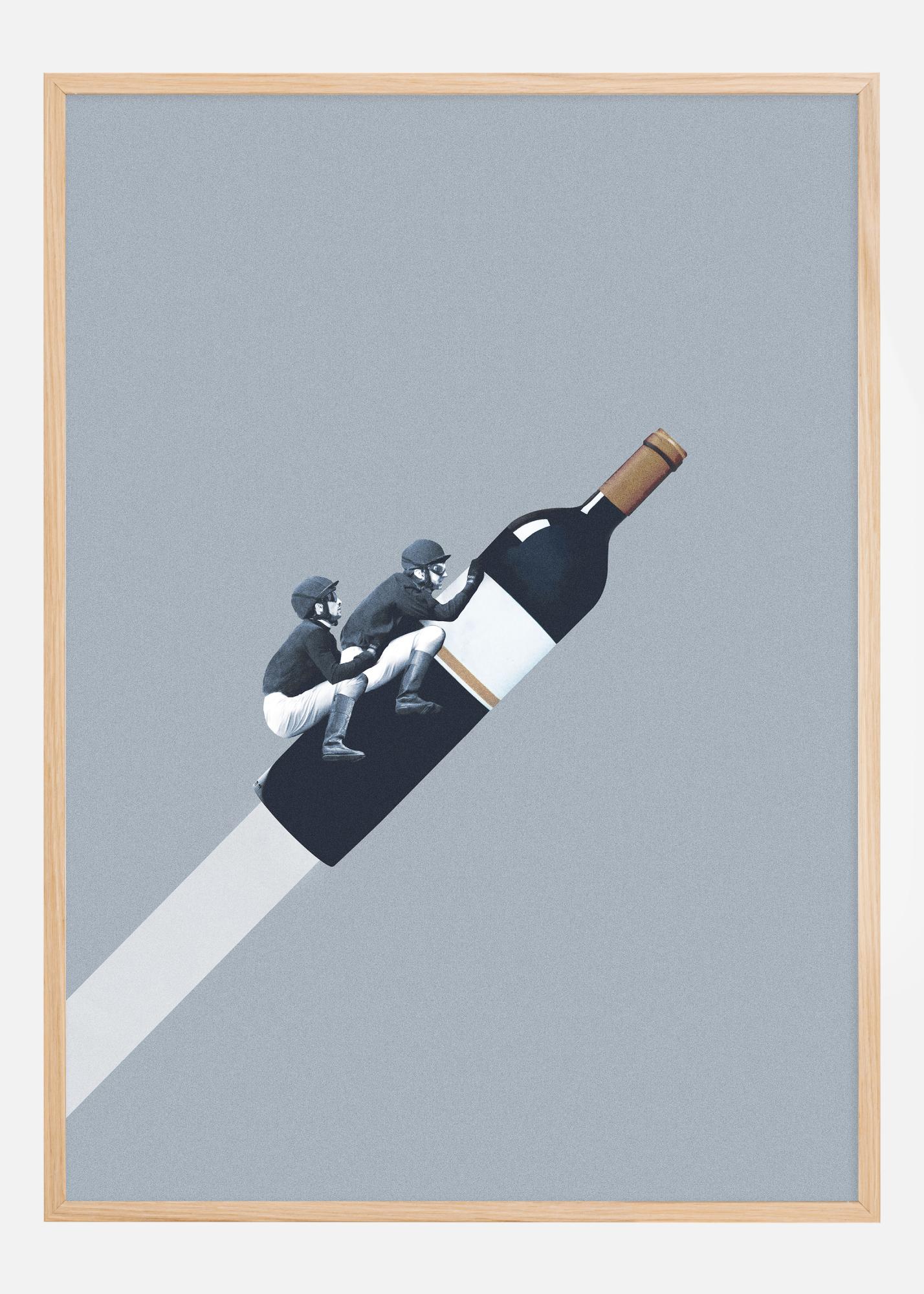 Ten unikalny i skłaniający do refleksji plakat przedstawia fantazyjną scenę, w której dwie osoby w klasycznym stroju jeździeckim triumfalnie jadą na pochylonej butelce wina. Scena jest dziełem kreatywnej wyobraźni, która splata tradycję z absurdem, tworząc poczucie przygody i eskapizmu. Pokazuje, jak dwóch jeźdźców może radzić sobie z winem codziennego życia z taką samą gracją i opanowaniem, jak gdyby jechali przez falujący krajobraz.