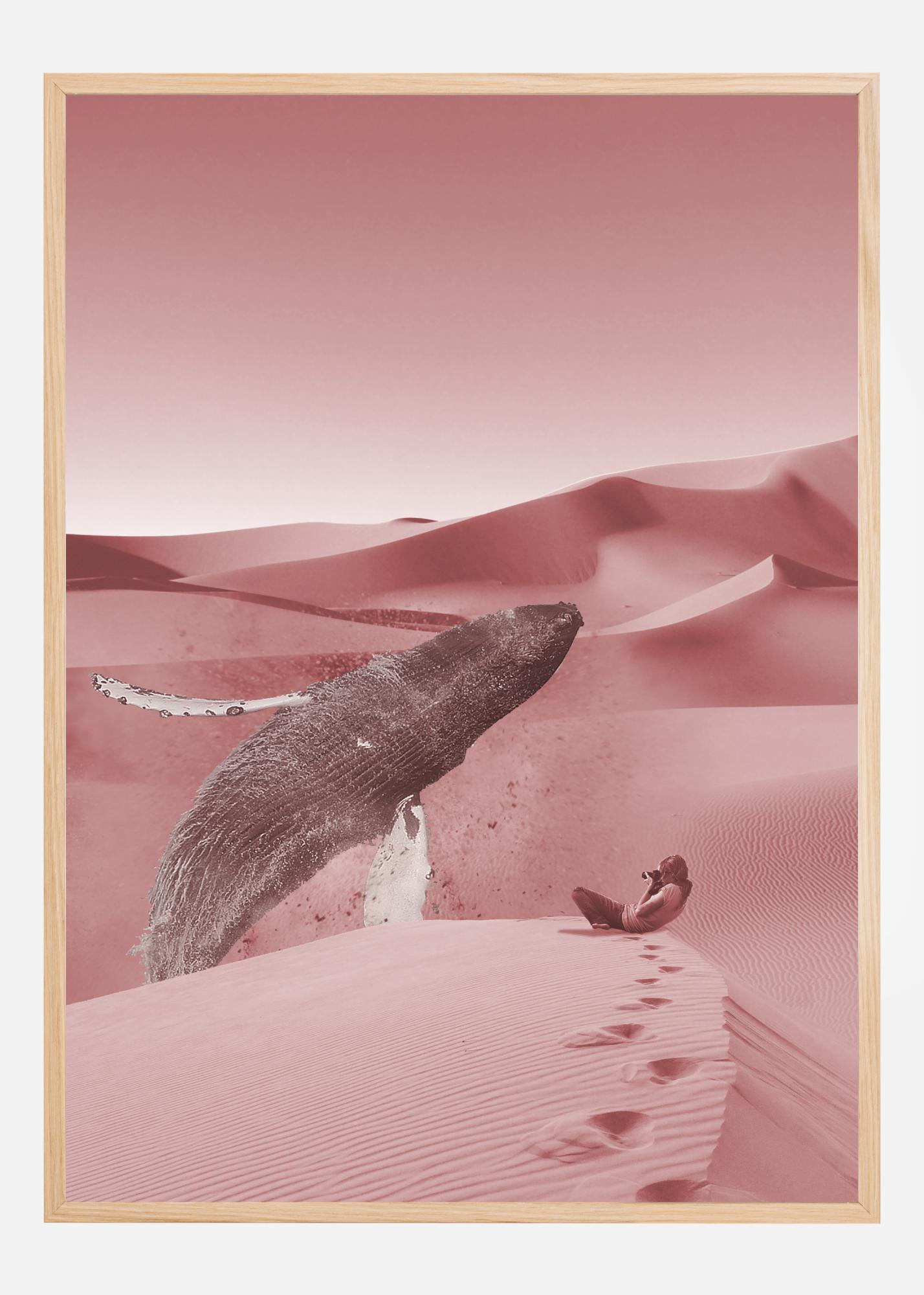 Wyobraź sobie surrealistyczny świat z tym artystycznym plakatem, na którym potężny wieloryb unosi się nad zmieniającym się krajobrazem różowych wydm. To nieoczekiwane połączenie olbrzyma morza i falujących wzgórz pustyni kwestionuje rzeczywistość i zachęca widza do świata fantazji. Różowy odcień, który przenika obraz, nadaje mu poczucie spokoju i zabawy, podczas gdy wyraźne ślady stóp prowadzą nas do opowieści, która czeka na odkrycie.