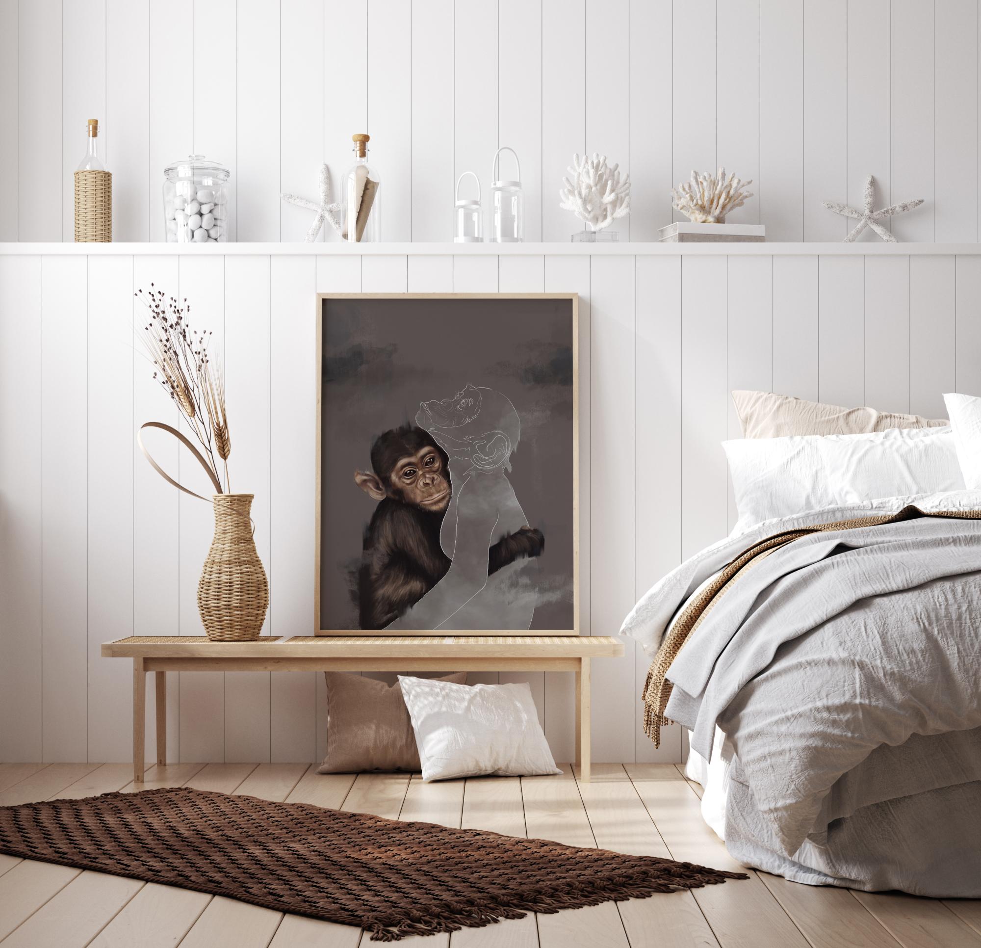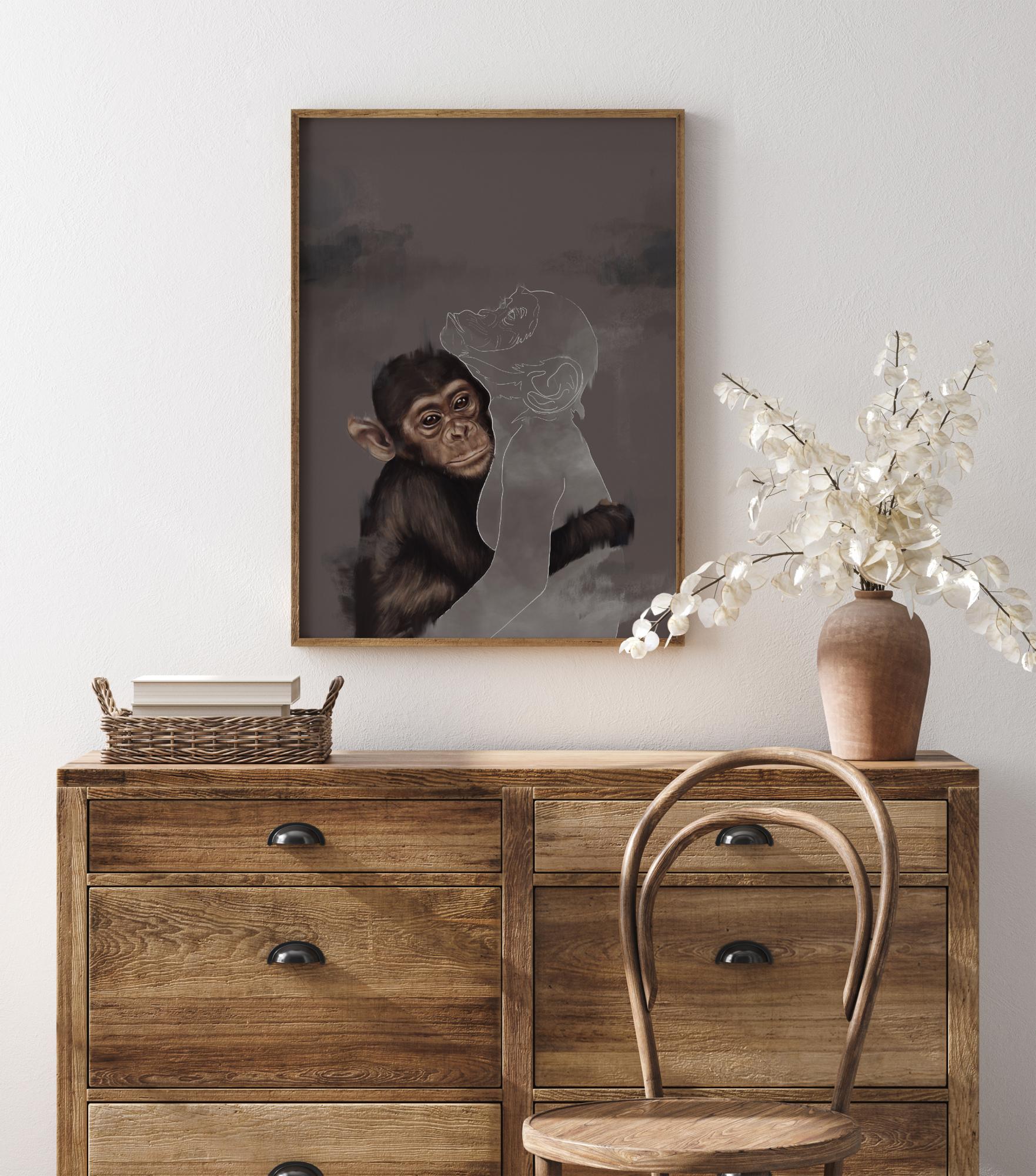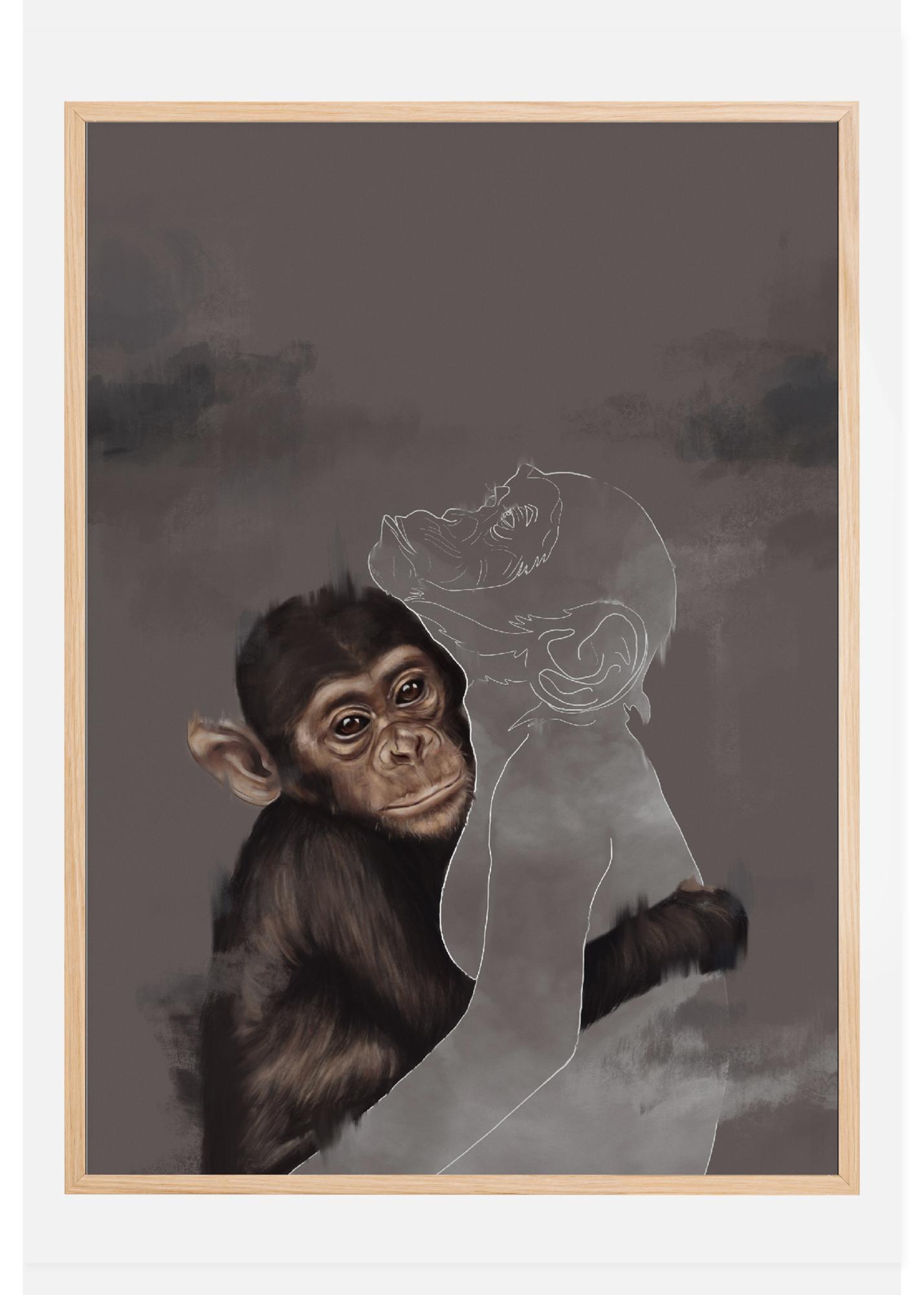 Fantastyczny plakat w mieszanej technice przedstawiający młodego szympansa przytulającego innego szympansa w konturze. Ten emocjonalny obraz zawiera szczegółowy malunek szympansa obejmującego białą konturę innego szympansa. Drugi brakuje, więc gdzie jest drugi małpka i dlaczego jej już tam nie ma?